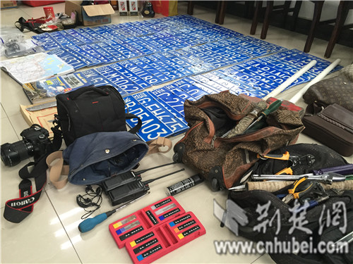 在江西宜春事御景東方小區(qū)某單元樓一樓獨立車庫,當卷簾門拉起時,民警終于見到了10個月來一直苦苦尋找的這輛本田雅閣。在車庫內(nèi),民警還發(fā)現(xiàn)了2個大麻袋,里面裝有近70套全國各地假車牌, 2本全國高速公路地圖及行車攻略、數(shù)套開鎖工具、撬棍鐵錘等作案工具,20余件帽子手套等偽裝服飾,4臺小功率對講機……當辦案民警逐一清點出來后,擺滿了車庫前近30平米的空地。