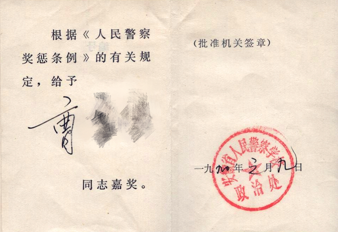 1990年,安徽省人民警察學(xué)校嘉獎(jiǎng)學(xué)員的證書(shū)。