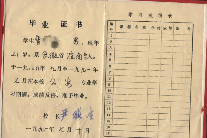 1991年安徽省人民警察學(xué)校公安專(zhuān)業(yè)的畢業(yè)證書(shū)。