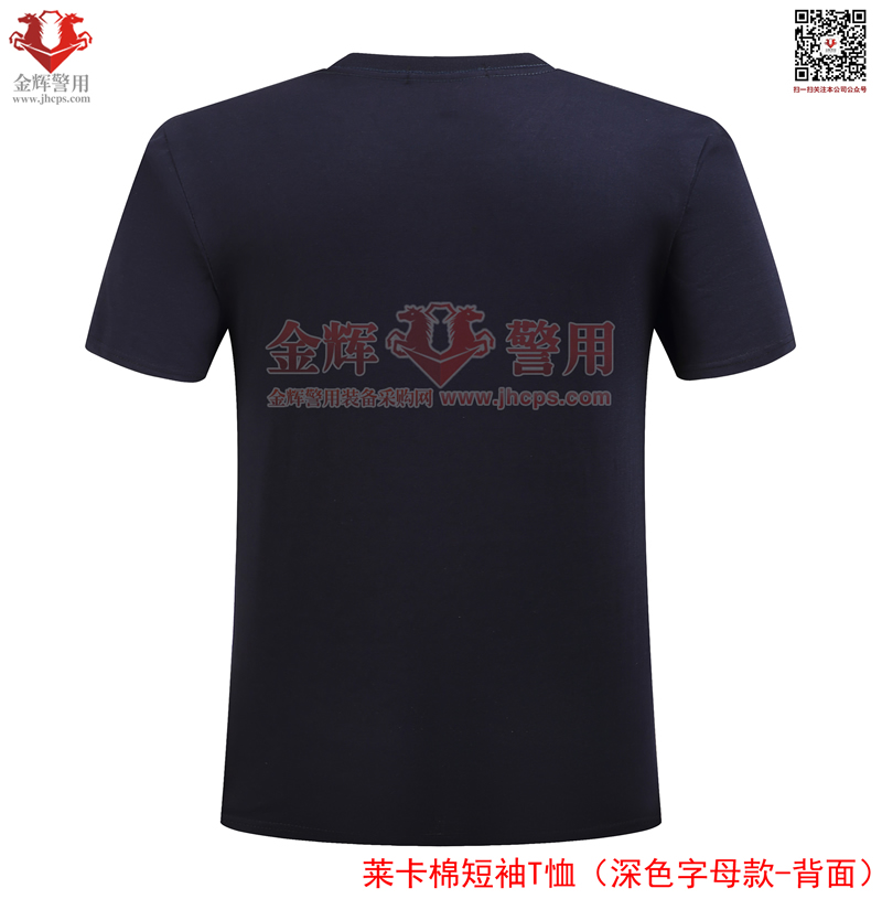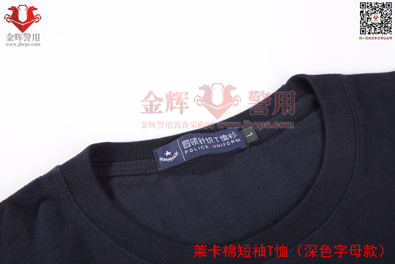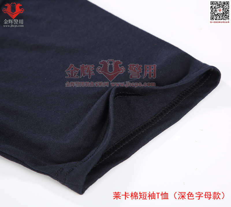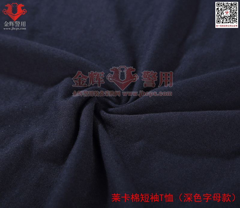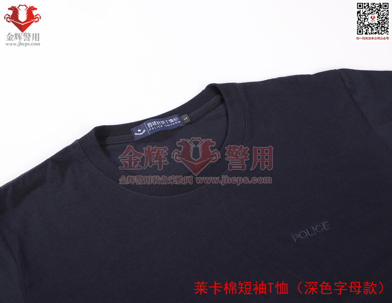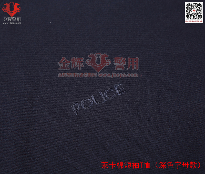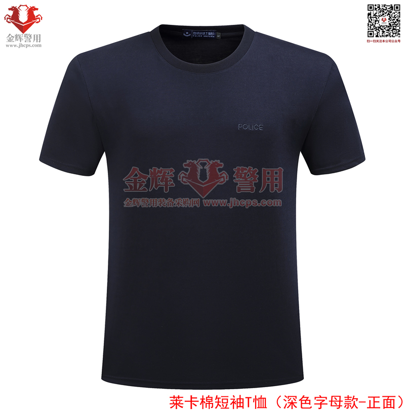 萊卡棉警用短袖T恤,深色刺繡字母款,面料顏色為藏青色。產品經濟,適合輔警或者經費欠缺單位選擇。