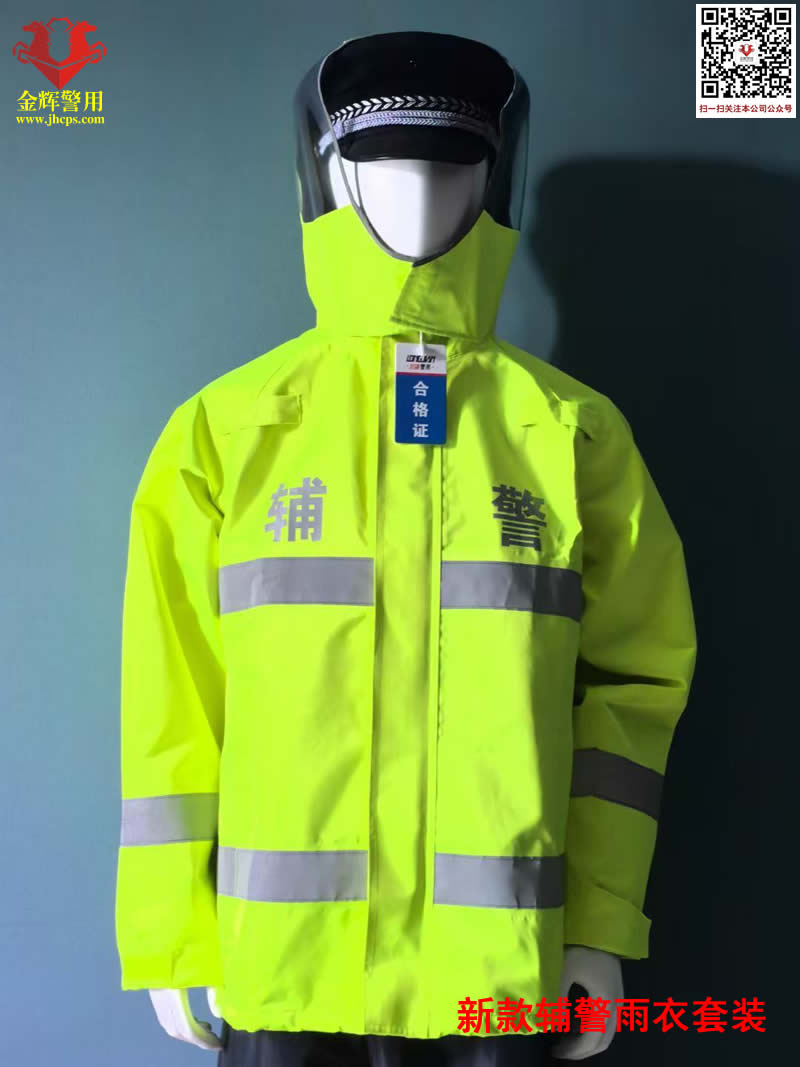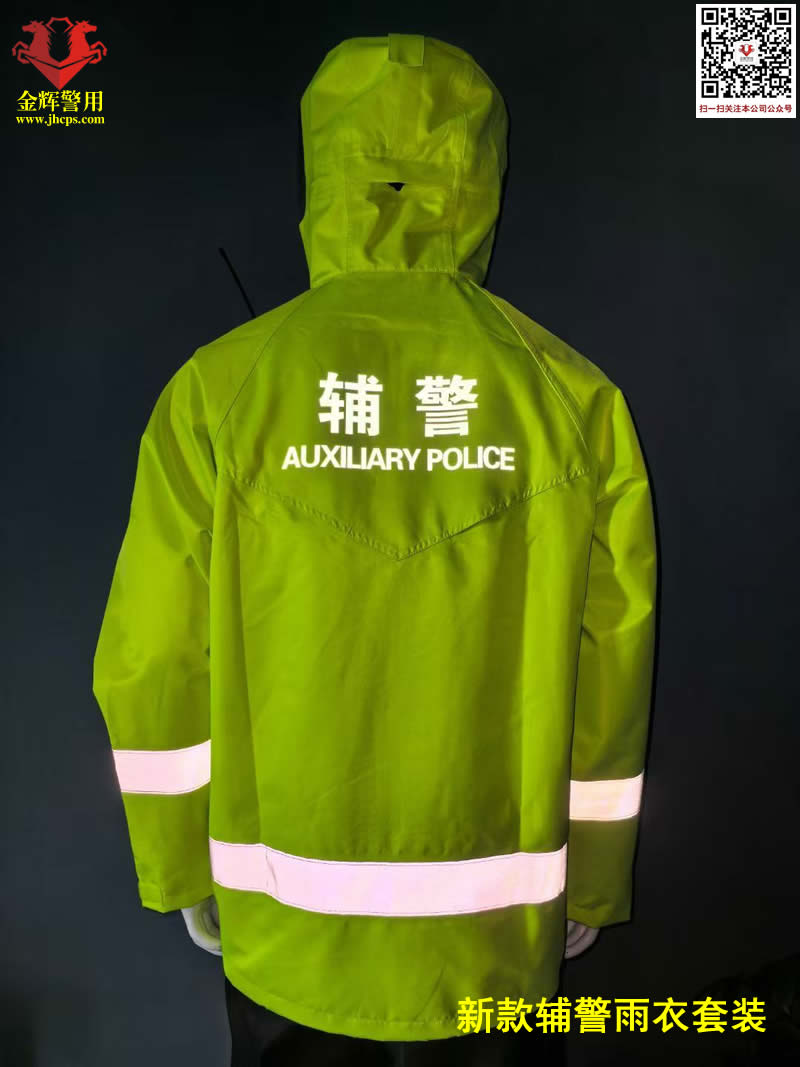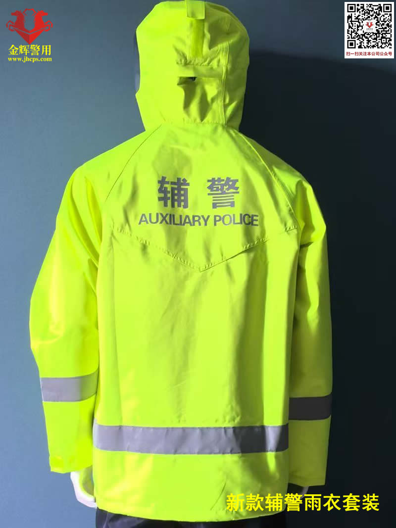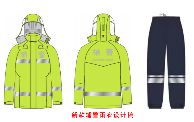 1.上衣:腋下偏下位置兩側有斜插口袋并配有防水拉鏈,衣袖處為防風袖口設計,防風袖口外側配有伸縮魔術貼帶用來調節袖口松緊度,防雨帽后端靠近頂部位置設計有魔術貼調節帶,帽頂后端偏下位置設計有調節袢,帽口一周用反光飾帶包邊,胸前左右配有對講機及執法記錄儀雙環掛袢。