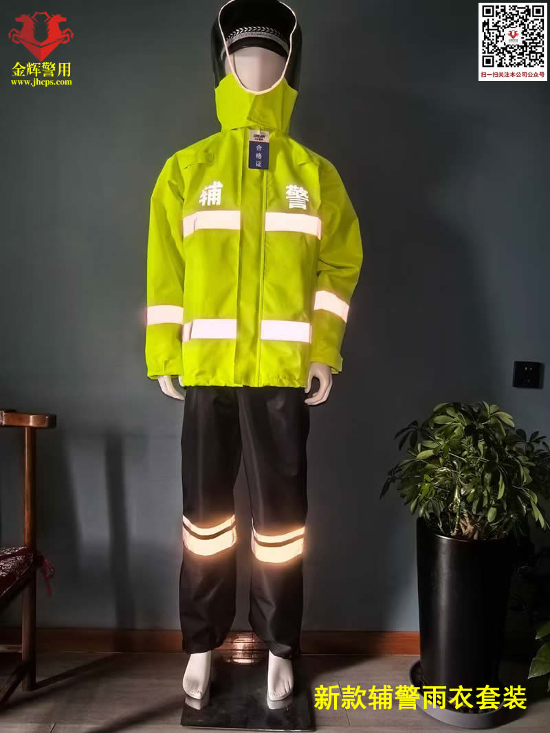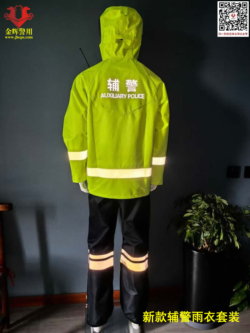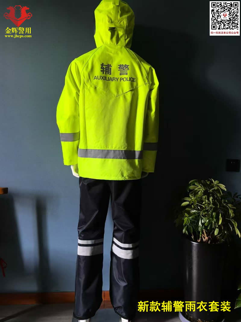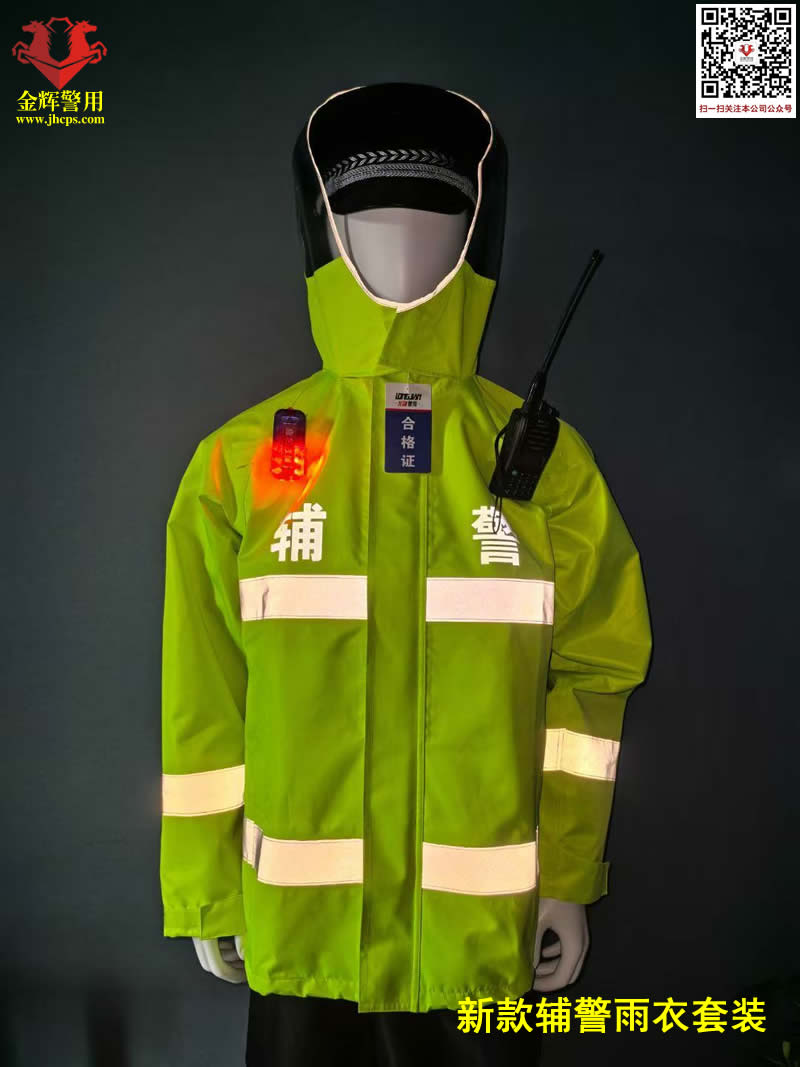 1.上衣:腋下偏下位置兩側有斜插口袋并配有防水拉鏈,衣袖處為防風袖口設計,防風袖口外側配有伸縮魔術貼帶用來調節袖口松緊度,防雨帽后端靠近頂部位置設計有魔術貼調節帶,帽頂后端偏下位置設計有調節袢,帽口一周用反光飾帶包邊,胸前左右配有對講機及執法記錄儀雙環掛袢。