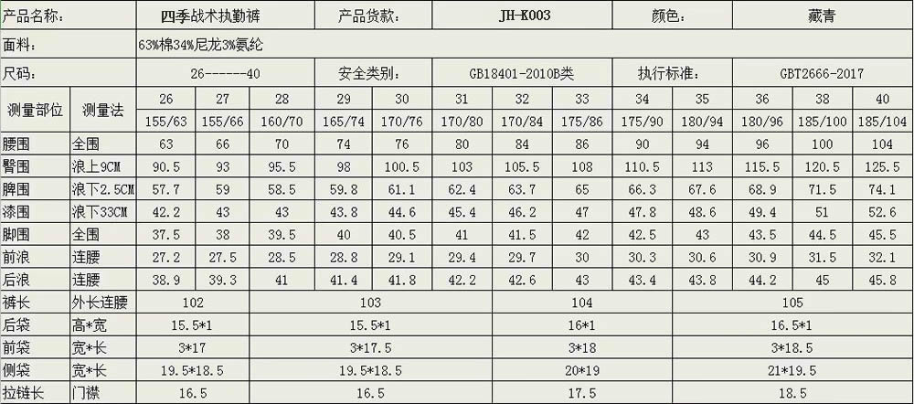 修身警用四季戰術執勤褲,采用60%棉,34%尼龍,3%氨綸面料,藏青色,上身美觀,伸展舒適,適合警用執法人員穿著。