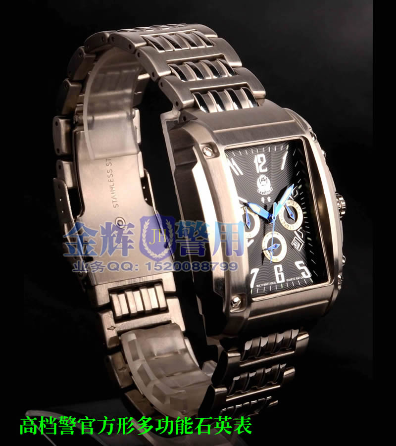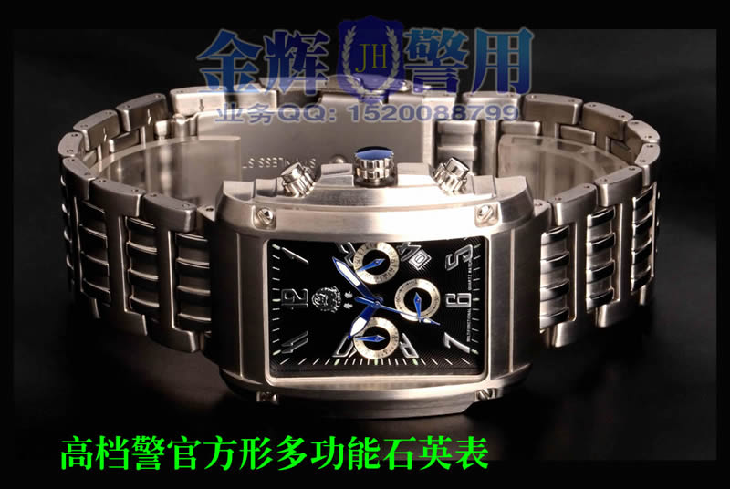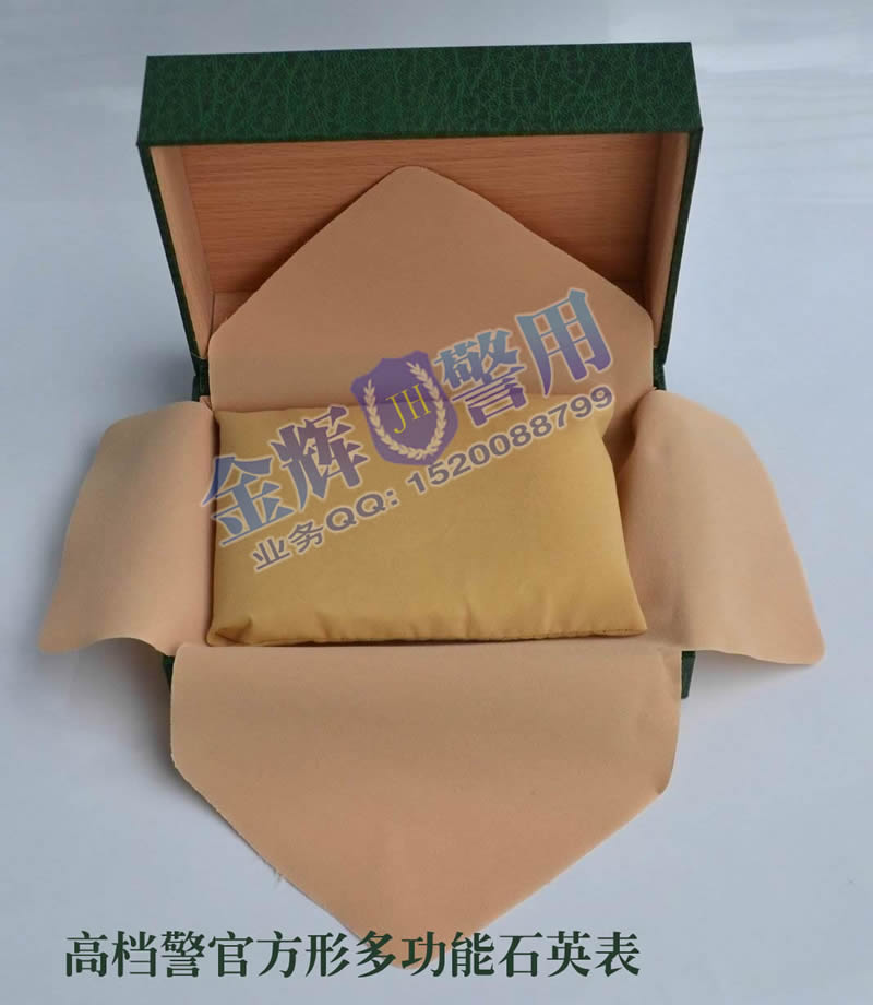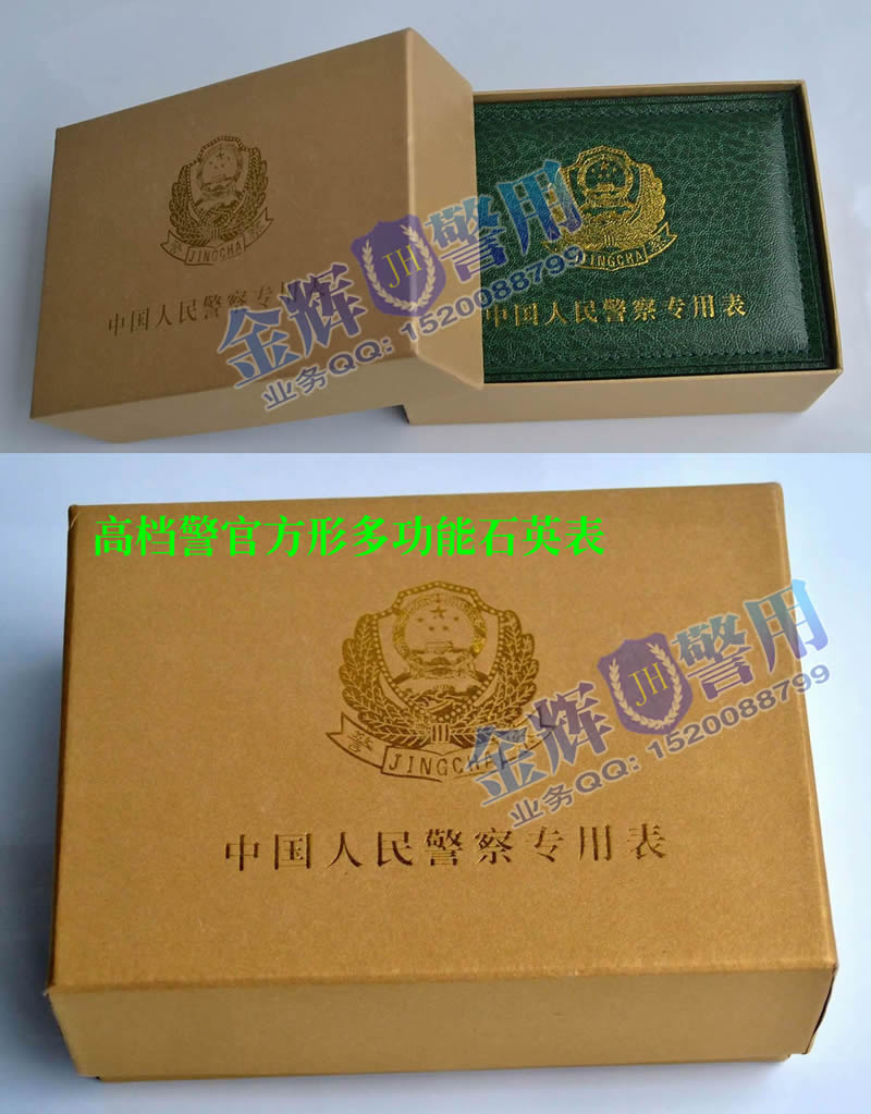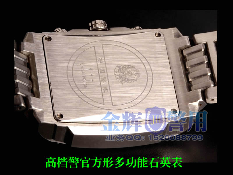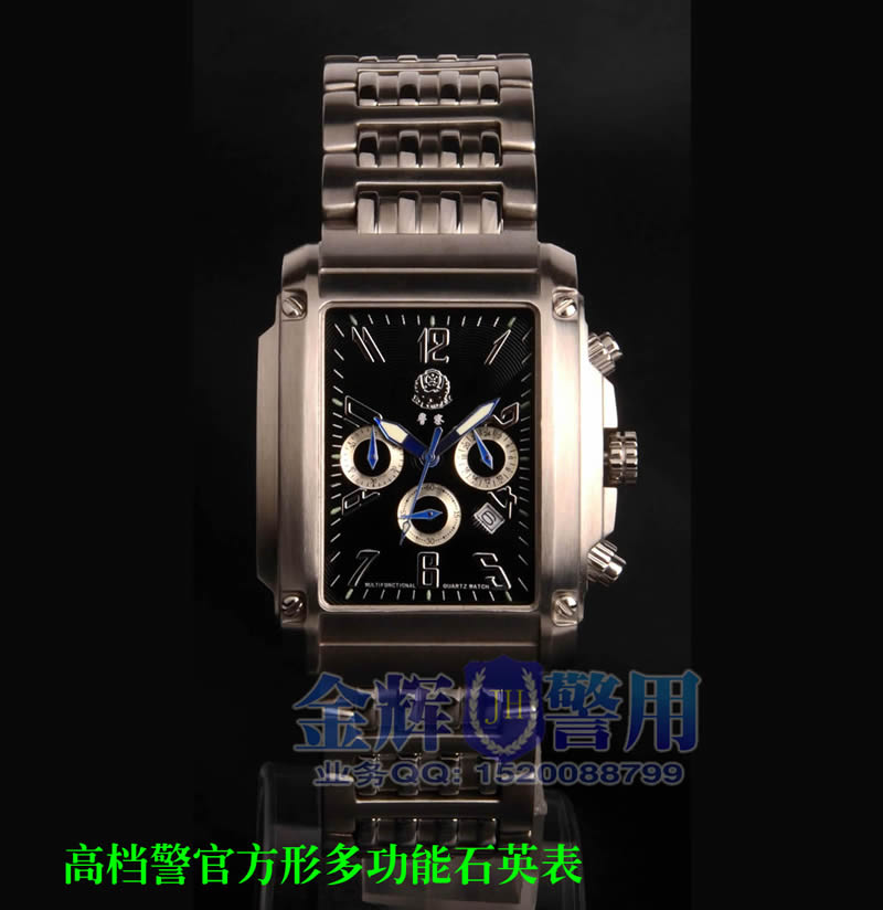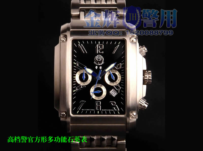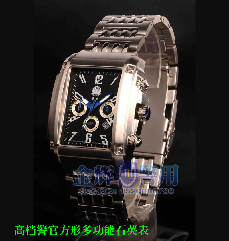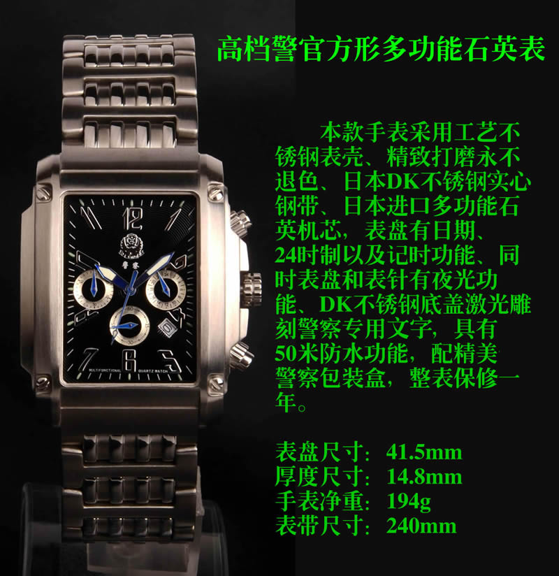 本款高檔警官方形多功能石英表系我國公安直屬單位定制采購高檔制式手表,采用工藝不銹鋼表殼、精致打磨永不退色、日本DK不銹鋼實心鋼帶、日本進口多功能石英機芯,表盤有日期、配24時制以及記時功能、同時表盤和表針有夜光功能、DK不銹鋼底蓋激光雕刻警察專用文字,具有50米防水功能,配精美警察包裝盒,本公司提供廠家免費保修一年服務,【老品牌金輝警用實力保證,放心選購】。