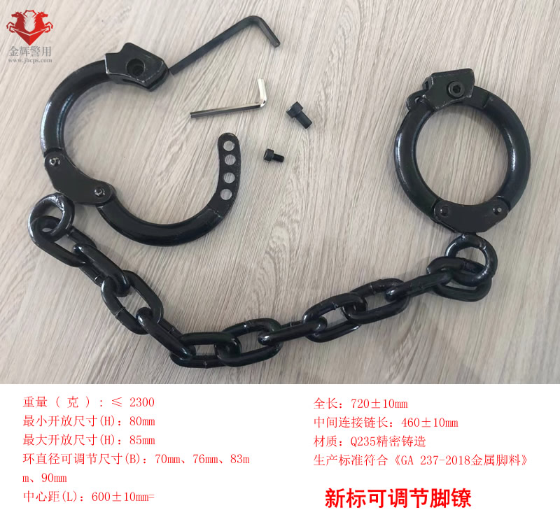 螺扣式腳鐐JL-LK600-YD-01 重量 ( 克 ) : ≤ 2300 最小開放尺寸(H):80mm 最大開放尺寸(H):85mm 環(huán)直徑可調(diào)節(jié)尺寸(B):70mm、76mm、83mm、90mm 中心距(L):600±10mm 全長:720±10mm 中間連接鏈長:460±10mm 材質(zhì):Q235精密鑄造 生產(chǎn)標準符合《GA 237-2018金屬腳料》中的有關要求。