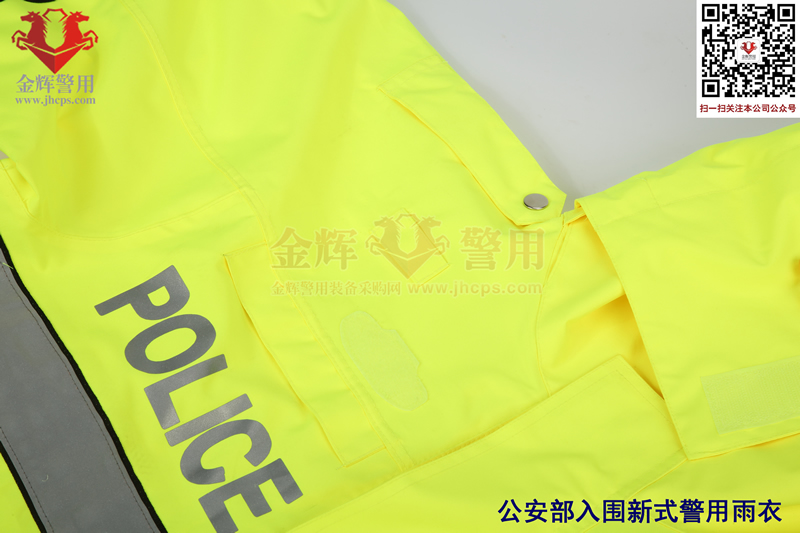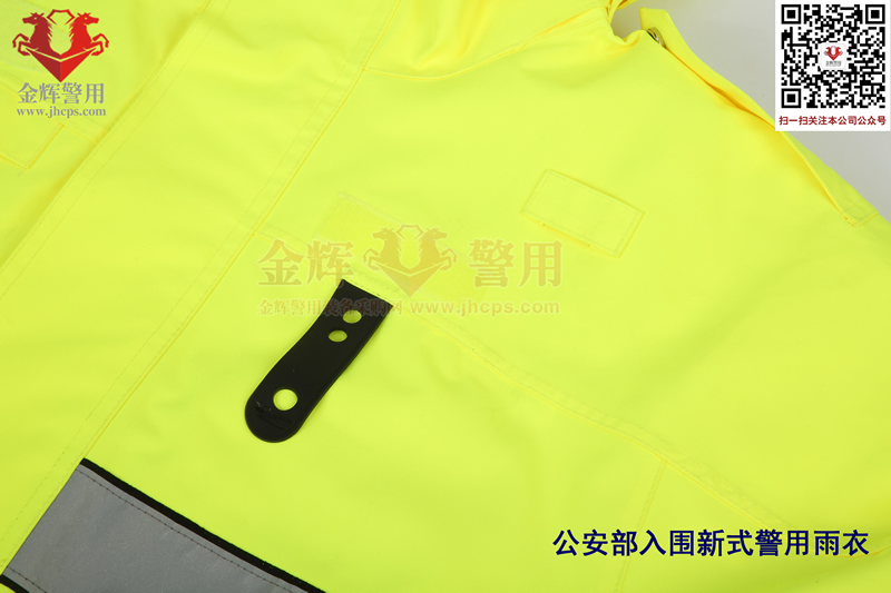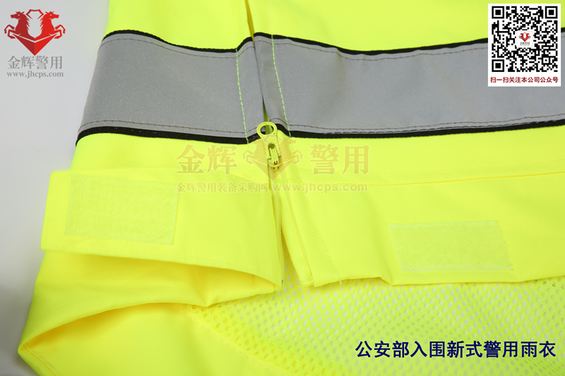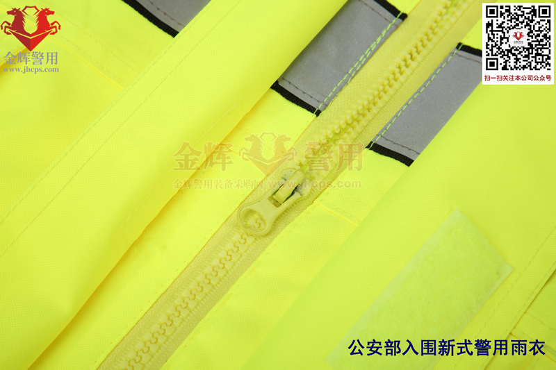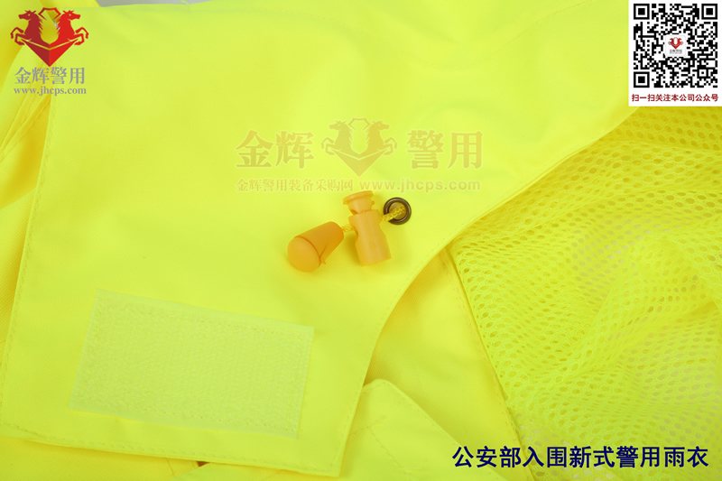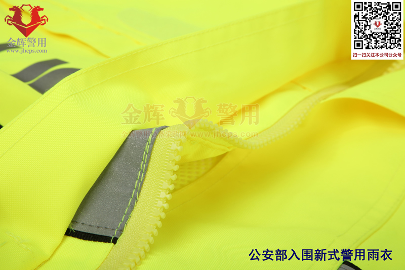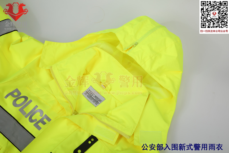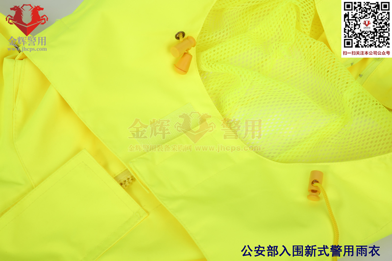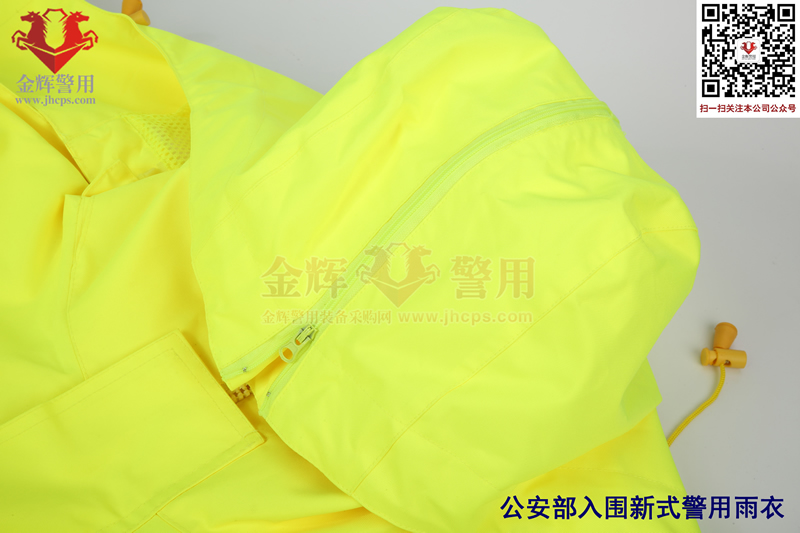 2、款式及功能:雨衣為中長款風衣樣式,顏色為熒光黃,衣服下擺兩側開叉設計,以便從褲子口袋拿取東西及開車方便入座;袖口處有收縮松緊及可調節(jié)魔術貼,能更好的防止雨水倒流進入袖內。拉鏈顏色為熒光黃與衣服同色,多功能防雨帽可拆卸可隱藏可佩戴大檐帽使用,并且配有肩章、臂章、對講機、執(zhí)法記錄儀掛袢及胸徽和警號魔術貼等功能。