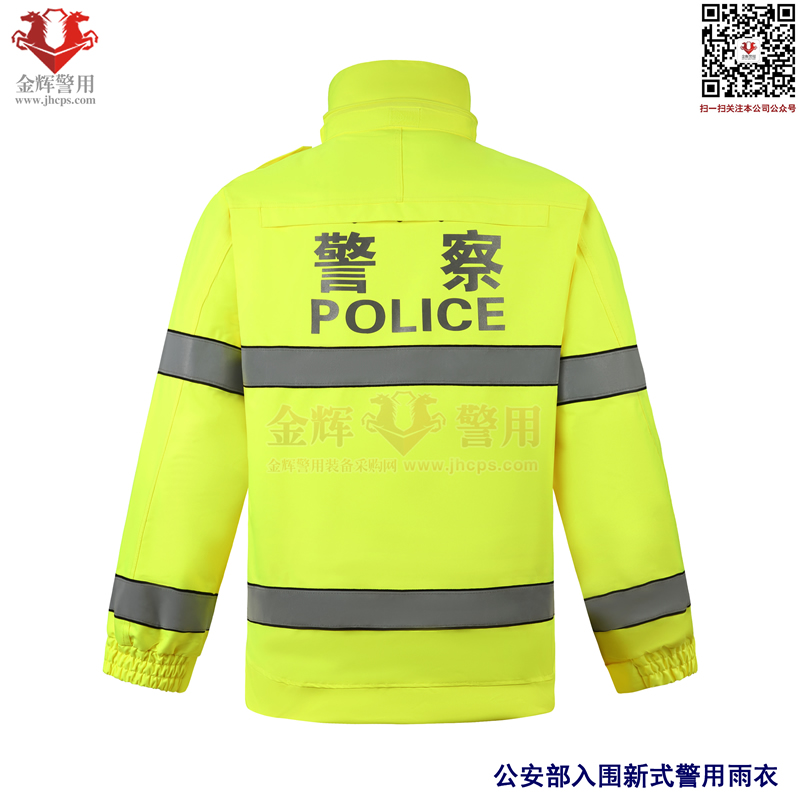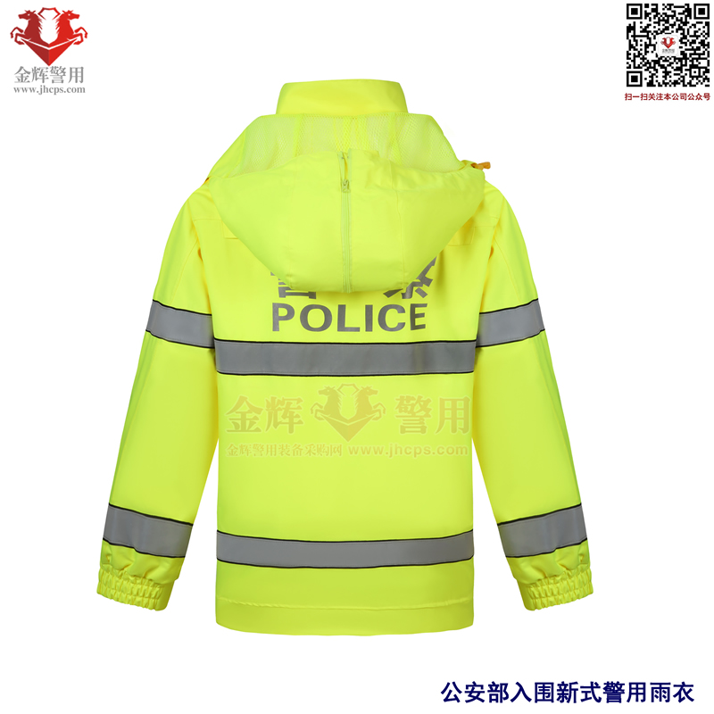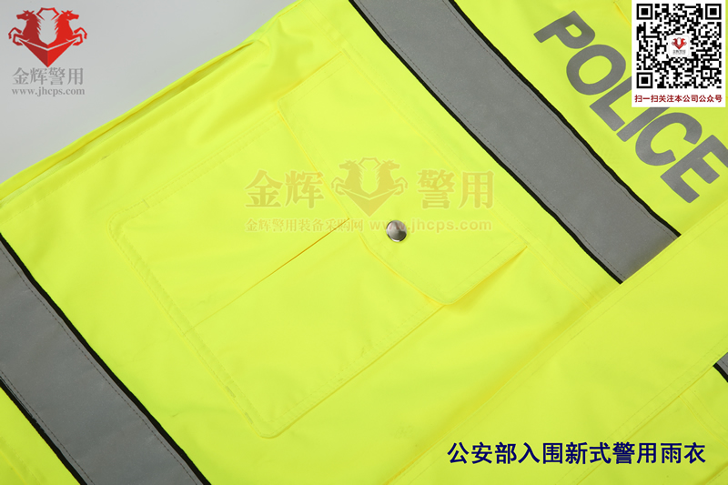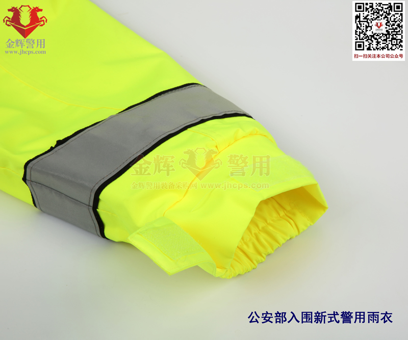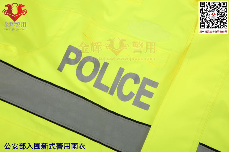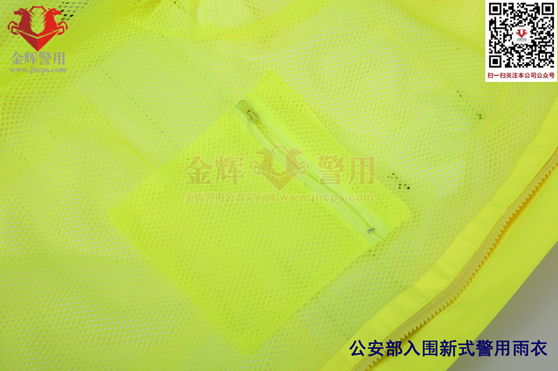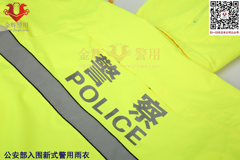 2、款式及功能:雨衣為中長款風衣樣式,顏色為熒光黃,衣服下擺兩側開叉設計,以便從褲子口袋拿取東西及開車方便入座;袖口處有收縮松緊及可調節(jié)魔術貼,能更好的防止雨水倒流進入袖內。拉鏈顏色為熒光黃與衣服同色,多功能防雨帽可拆卸可隱藏可佩戴大檐帽使用,并且配有肩章、臂章、對講機、執(zhí)法記錄儀掛袢及胸徽和警號魔術貼等功能。