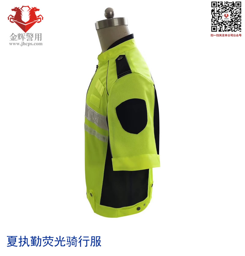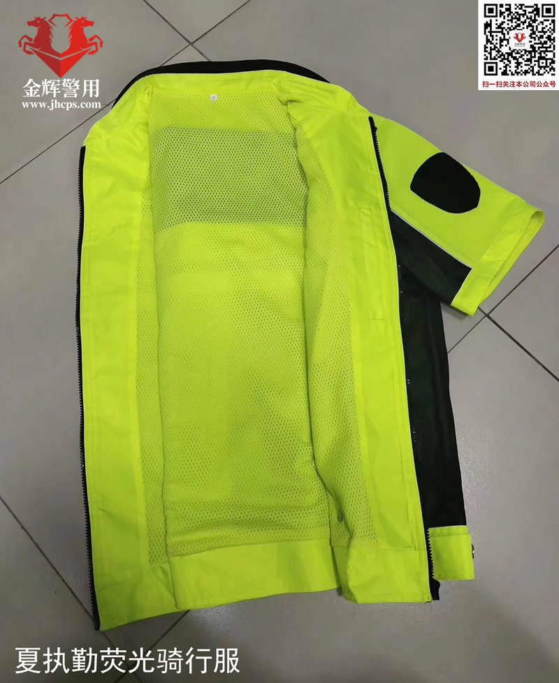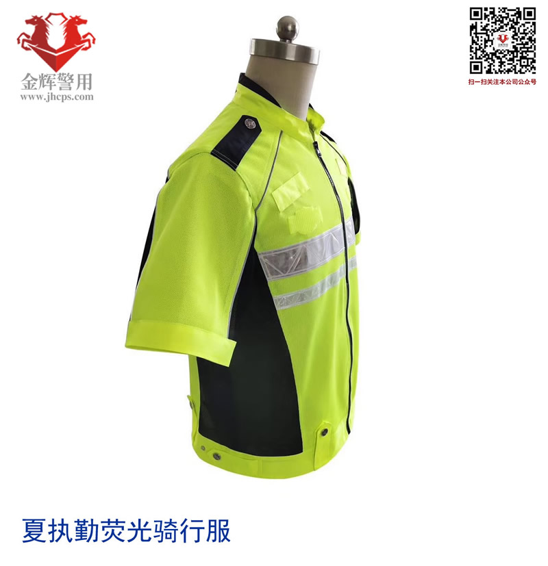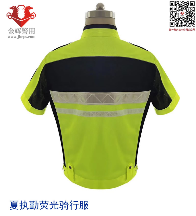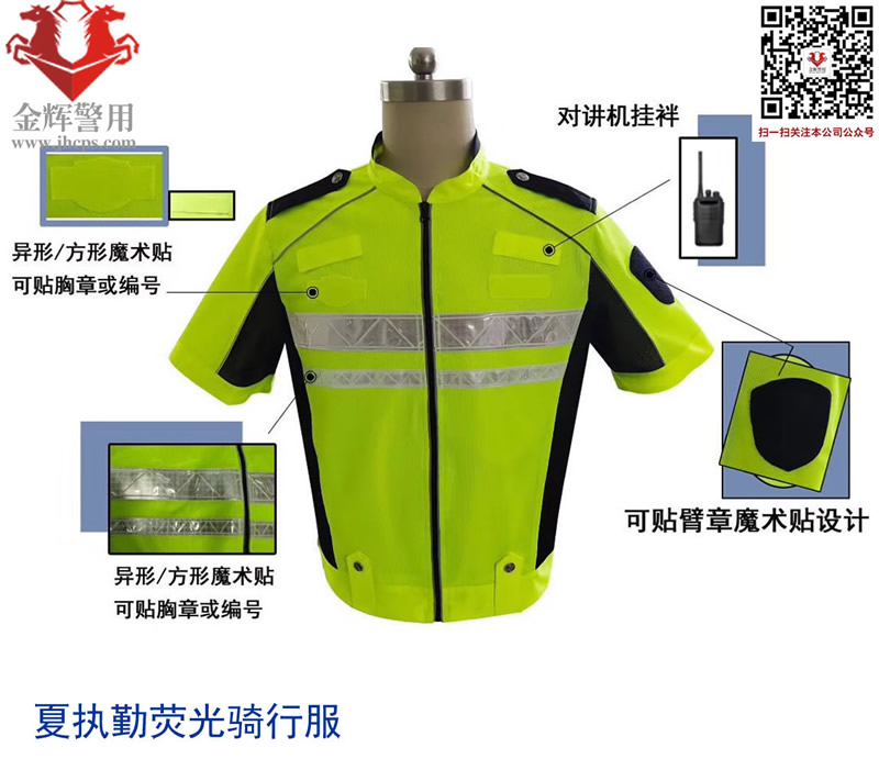 產品說明:上衣主面料顏色熒光黃黑拼色,更簡潔大氣。肩部有佩戴肩章袢帶掛扣設計,左臂有佩戴臂章專用魔術貼,前胸有佩戴胸章和對講機掛扣,后背附帶亮銀反光條,可定制后背文字。內里采用網眼透氣環保面料,同時內部附帶口袋設計,方便攜帶隨身物品。材料耐磨,可作為夏執勤服或騎行服使用。