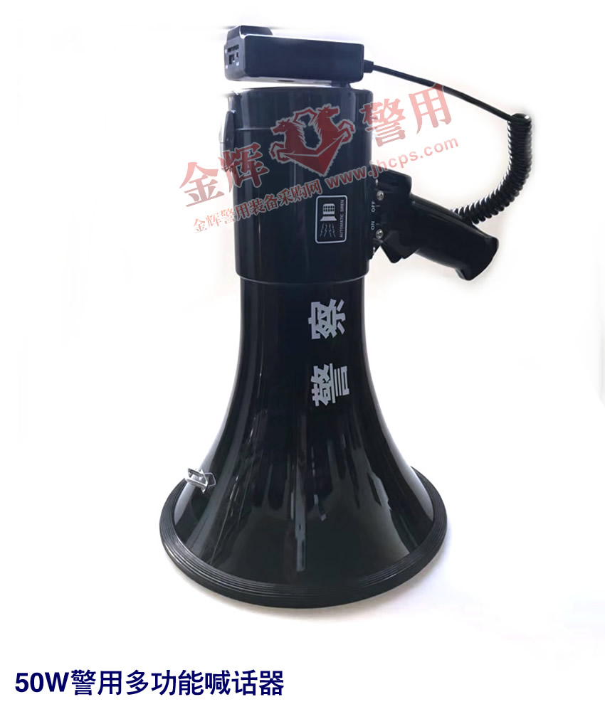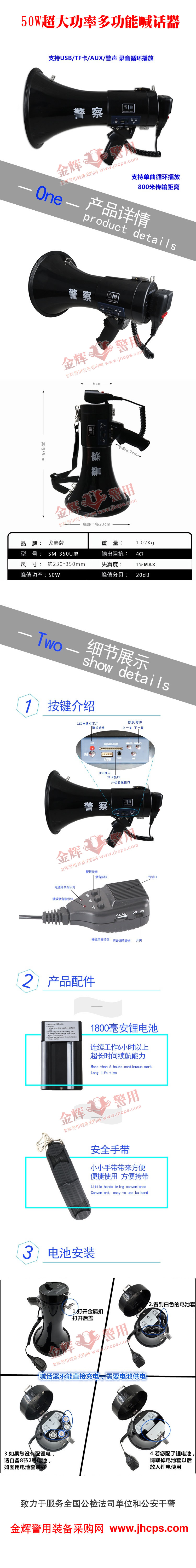 喊話器 材質:ABS工程塑料 最大功率:50W 輸出阻抗:4Ω 失 真 度:1% MAX 傳送距離:>800m 峰值分貝:20dB 錄音時間:15s 重量:1.4kg 喊話時間:10-20小時 尺寸:約230×350mm(口徑×長度) 功能:喊話、USB插口、警報、錄音、放音、U盤播放