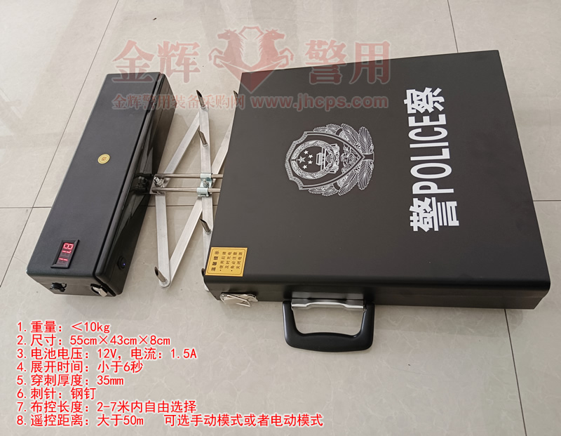 1.重量:<10kg 2.尺寸:55cm×43cm×8cm 3.電池電壓:12V,電流:1.5A 4.展開時間:小于6秒 5.穿刺厚度:35mm 6.刺針:鋼釘 7.布控長度:2-7米內自由選擇 8.遙控距離:大于50m 9.可選手動模式或者電動模式