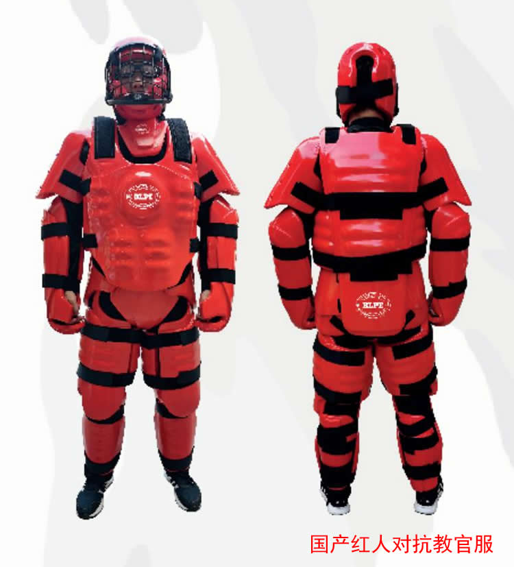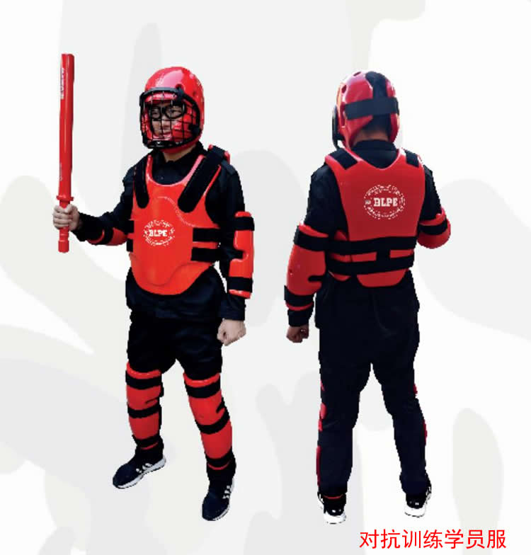 1、防水特性,可用于水上訓練,可快速清洗,可多人輪流使用,單向透氣。 2、全套采用高強度環保記憶海綿制作,表面為無縫結皮工藝加工,貼近口鼻無刺鼻異味。 3、教官服于-35℃-+40℃的環境條件下,仍可正常使用,并具有抗擊打、耐沖擊性能;教官服在-35℃-+40℃的環境條件下,上下層粘合處開膠面積應≤10%;漆面不得開裂;單條粘合魔術貼開膠應≤10%,不得脫落。 4、防護頭盔:靈活轉動保護頭盔配鋼網面罩及護目鏡保護前臉部。 5、護目鏡:護目鏡應表面光滑、無毛刺、無銳角;護目鏡透光率應≥85%,應具有防霧功能; 6、護手臂:含拳峰保護,橋梁形一片式指環套(底板長≥65mm、底板最寬位置≥75mm、底板最窄位置≥50mm),護手臂主體和拳峰彎曲處弧度≥85°。 7、胸背部:由精確弧度設計,兩側彎曲度≥75°,中心圓鼓型,周邊輻射型組件,保護胸口、肋骨等人體重要部位。背部加長組件有效保護脊骨,胸口圓鼓形和后背凸起位置可抵御低動能沖擊。 8、腿部:大小腿分兩個組件,由四個拱形部件組成包裹式護大腿;一體式護膝腿及小腿肚,膝蓋采用圓鼓型設計充分保護訓練者在跪地等動作中不受傷害。 二、標識、顏色要求 1、教官服各部件應有永久性不能擦拭的名稱標識,方便使用人員對裝備的辨認及穿戴。 2、教官服主體部件顏色應為紅色(面罩、護目鏡、松緊帶、魔術貼除外,現場提供樣品比對)。