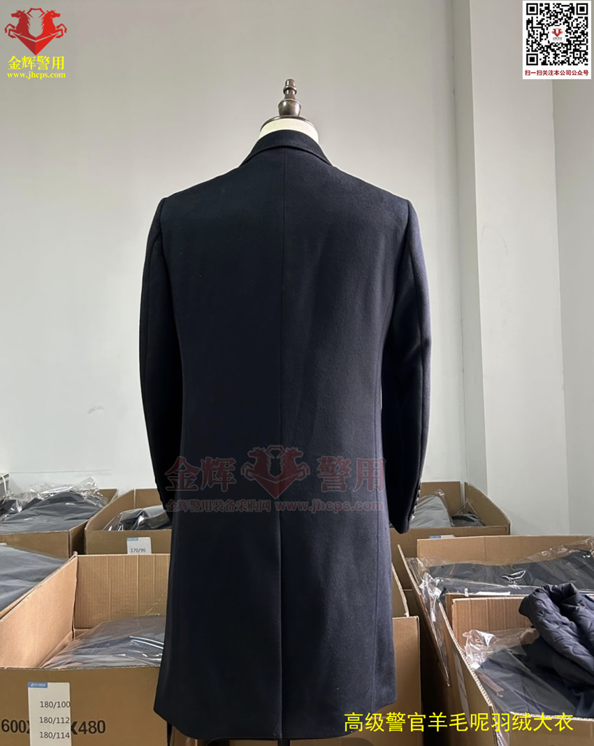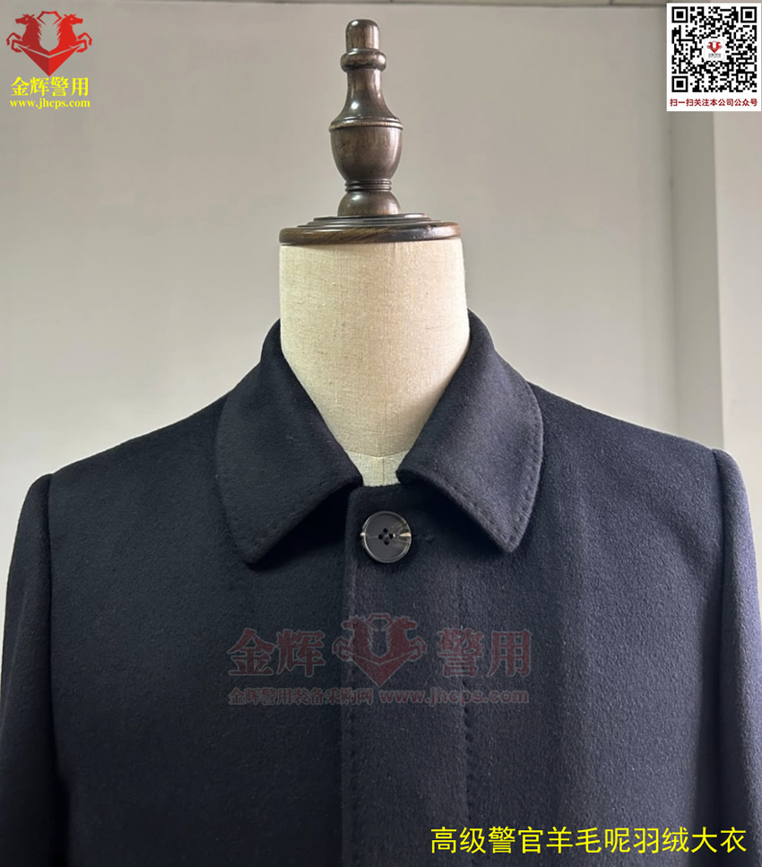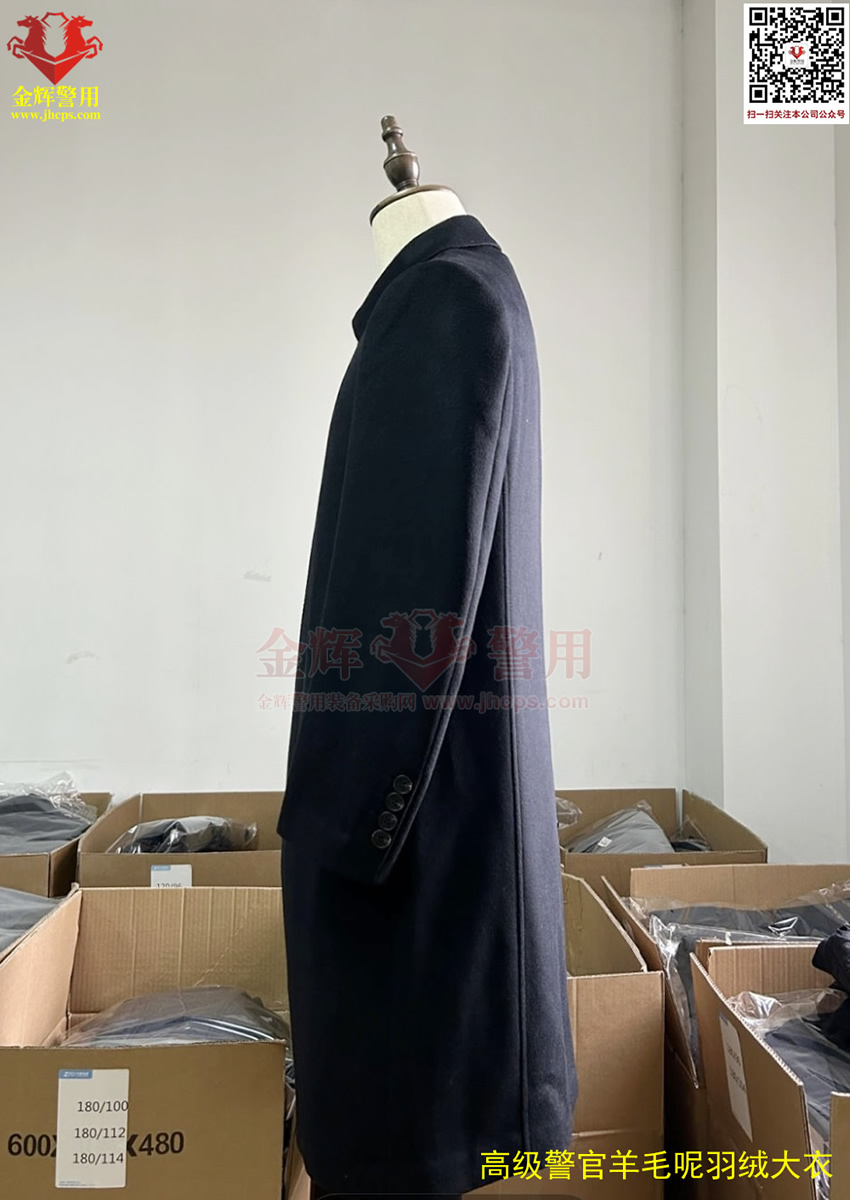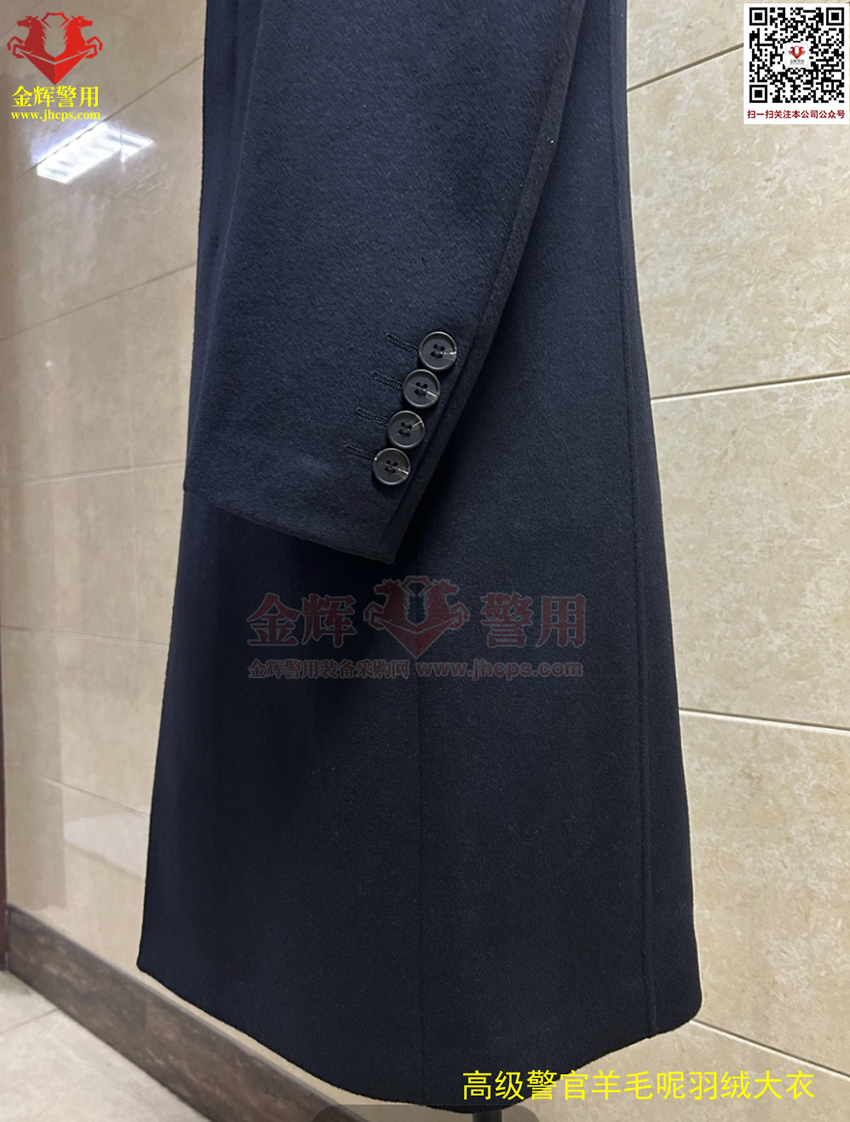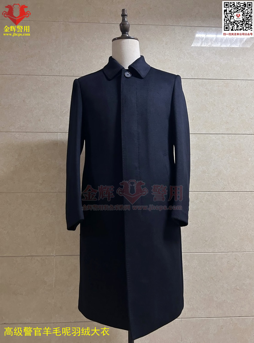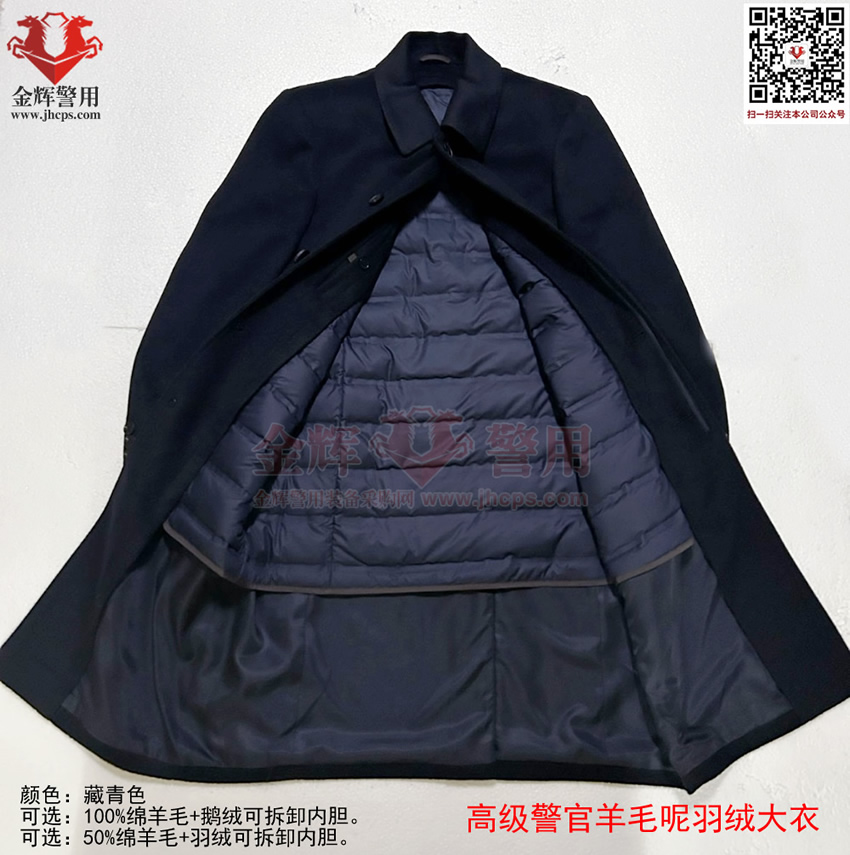 高級警官羊毛呢羽絨大衣,藏青色,可選100%綿羊毛+鵝絨可拆卸內膽和50%綿羊毛+羽絨可拆卸內膽。凡是已經升級高級警官的都可以配置本款大衣。公安部入圍企業產品,可根據身材預定,凡是升級高級警官的都可配置此款大衣。