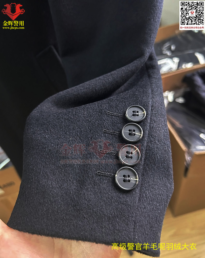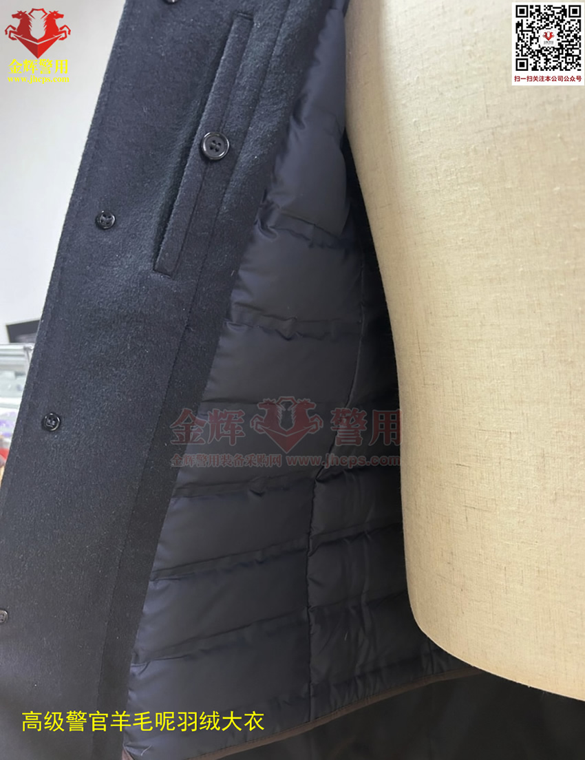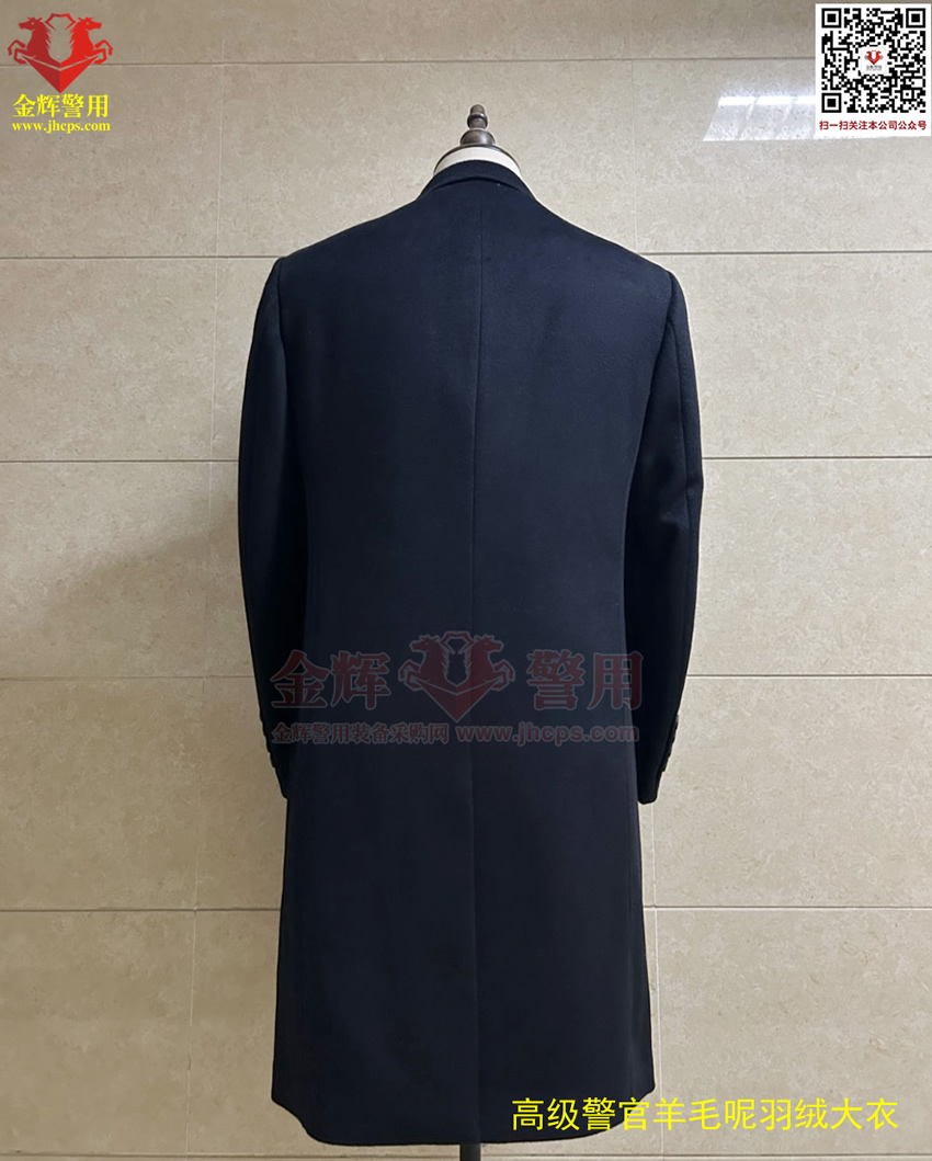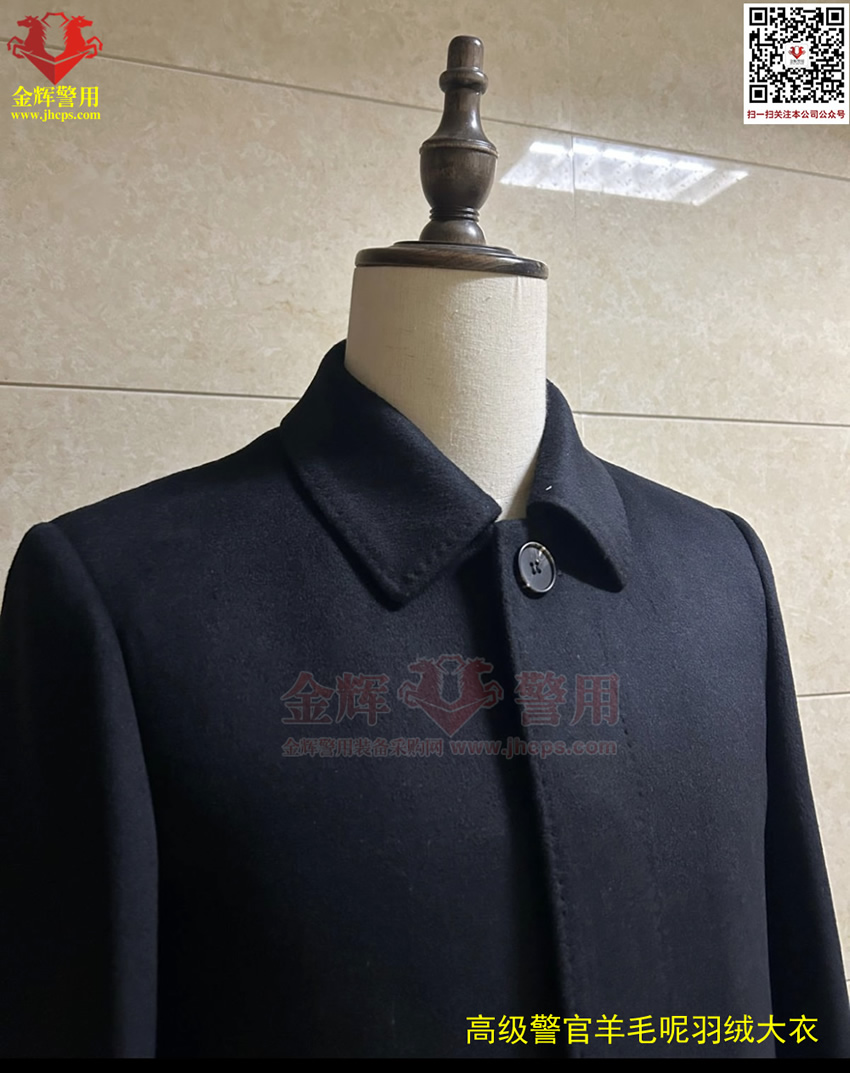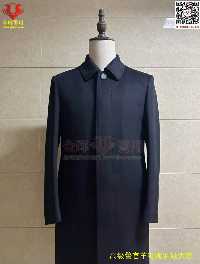 高級警官羊毛呢羽絨大衣,藏青色,可選100%綿羊毛+鵝絨可拆卸內膽和50%綿羊毛+羽絨可拆卸內膽。凡是已經升級高級警官的都可以配置本款大衣。公安部入圍企業產品,可根據身材預定,凡是升級高級警官的都可配置此款大衣。