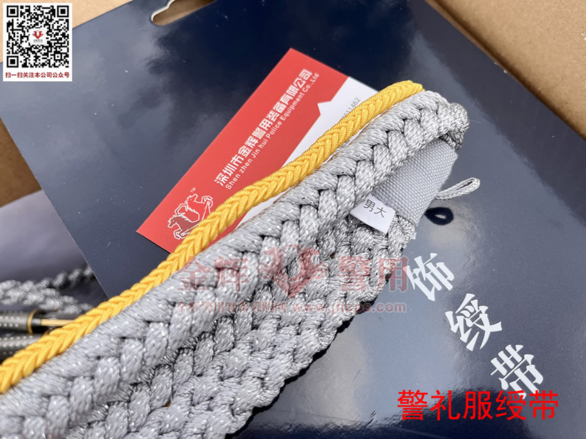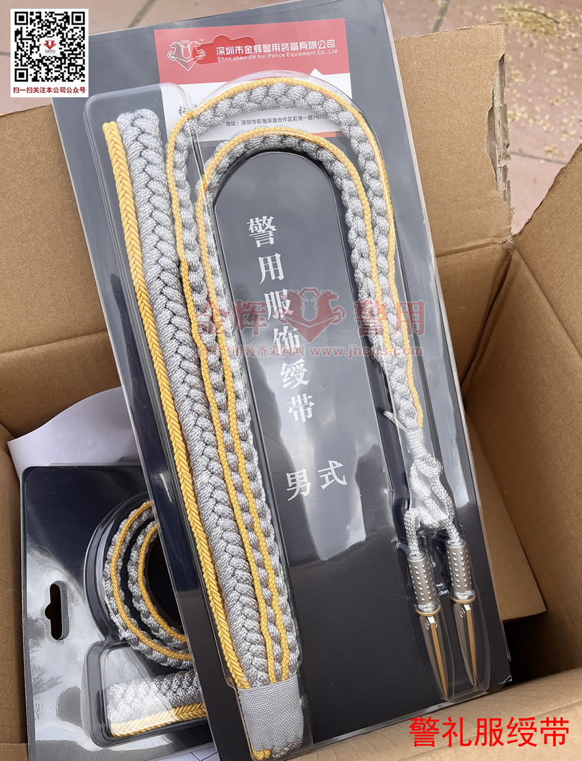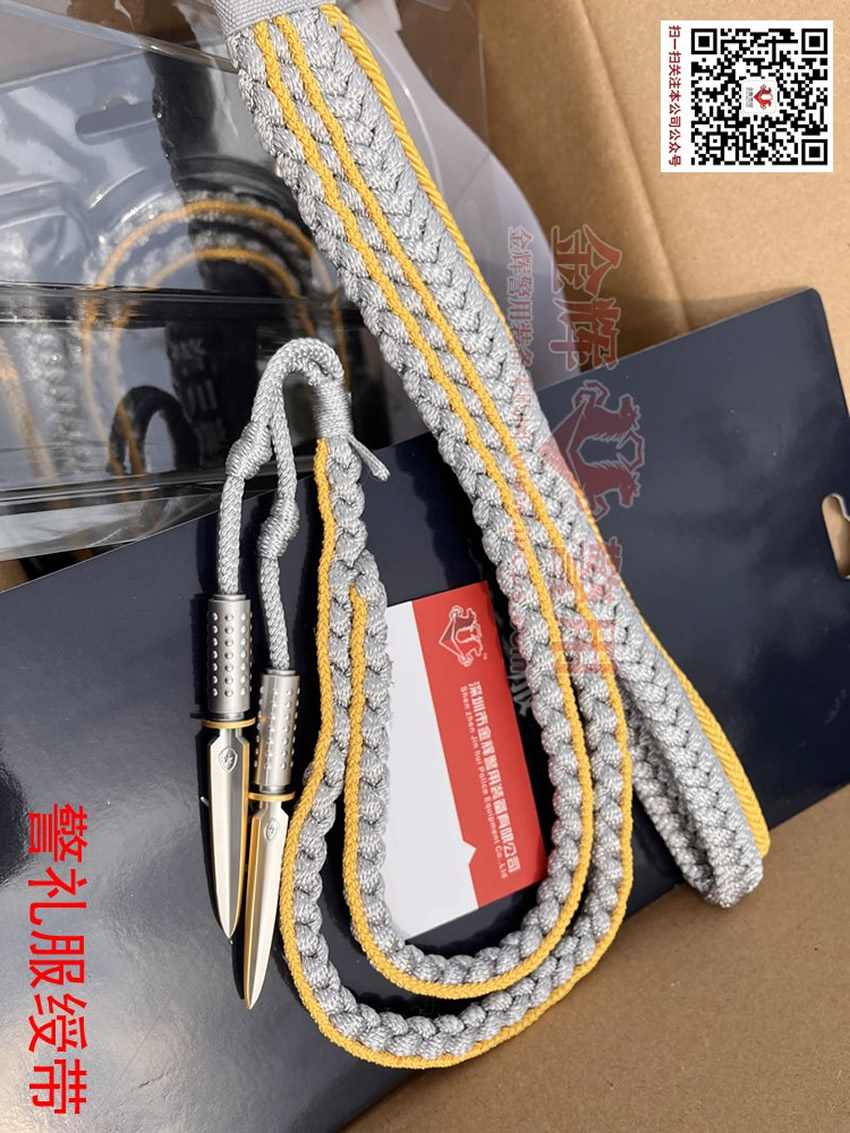 警禮服綏帶保養方法: 1.不得用利器刻劃墜體表面。 2. 請用中性洗滌劑輕柔清洗帶體。 3.嚴禁明火,避免與腐蝕性物質接觸。 警禮服綬帶裝配方法: 綬帶分為男款和女款,綬帶號型應與服裝號型相匹配 (例如: 服裝號型為男175~185,則綬帶號型為中號)。佩戴時男左女右,袖籠穿入環狀綬帶中,綏帶中間連接布放于肩祥下端,扣拌與肩部綬帶扣系好吊墜扣祥與前胸駁頭下綬帶扣系好,吊墜自然懸垂至第一粒扣處;環狀綬帶按扣與服裝后袖籠處按扣扣好;綬帶整理平整。