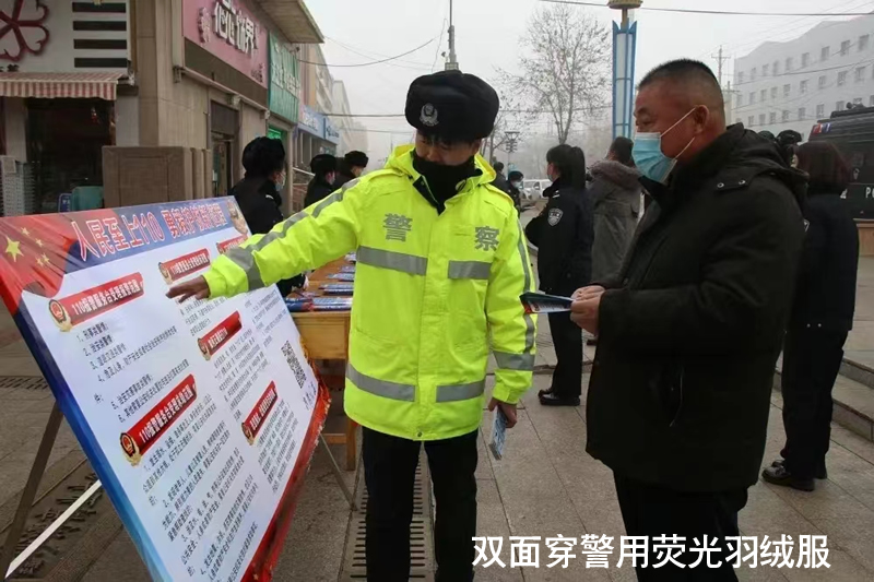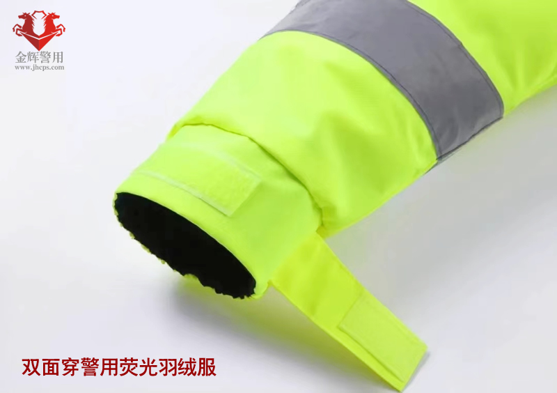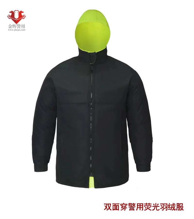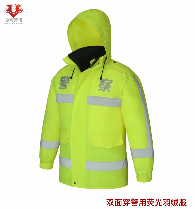 一、雙面穿反光羽絨服主要功能: 1、雙面穿反光羽絨服正面為熒光黃色反面為藏藍色,其主要功能有:防雨、防風、防寒;胸前和下擺處采用5公分寬度亮銀反光條沿前后身360度一圈以及左右肩前后和衣袖處分別采用5公分亮銀反光條纏繞一圈,起到反光警示作用,為執勤民警安全起到安全防護作用。 2.里層衣袖腋下部位設計有暗藏拉鏈便于羽絨內膽隨意拆卸安裝。 3.防風衣帽設計為可內藏功能,不使用時可內藏到衣領內部,顯示出衣服整體美觀大方。 二、外層面料材質為150D熒光黃牛津布貼膜面料,內層為高密度春亞紡貼膜面料。 產品執行標準 1、GB/T 3923.1-1997 斷裂強力; 2、GB/T 3920-2008 耐干摩擦色牢度; 3、GB/T 3920-2008 耐濕摩擦色牢度; 4、GB/T 21196.1-2007 耐磨性能 5、GA392-2009 外觀疵點要求; 6、GA446-2003 反光條逆反射系數 7、GB/T14272-2011 羽絨內膽充絨量;