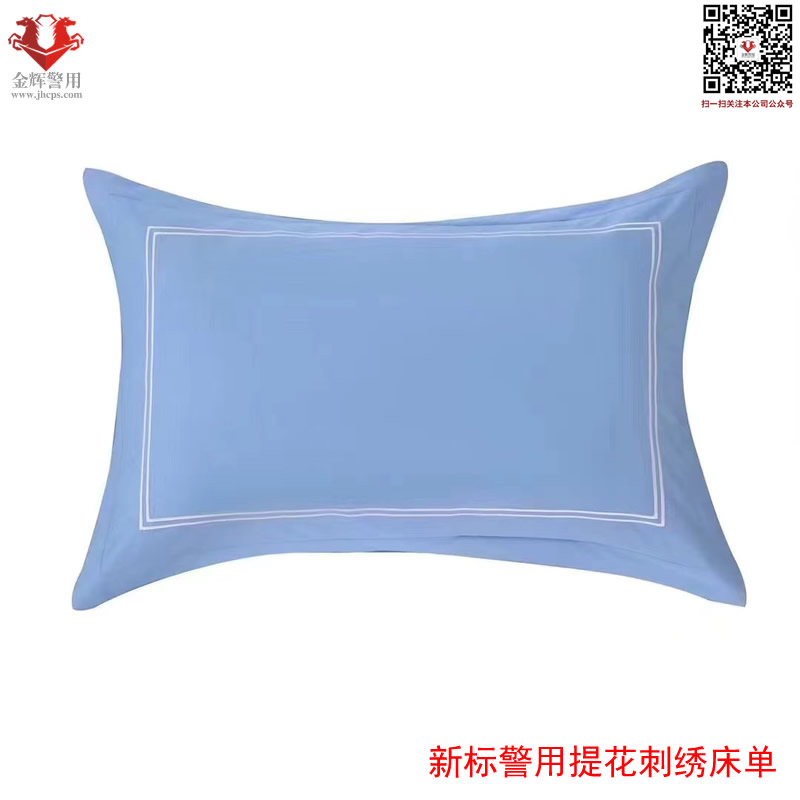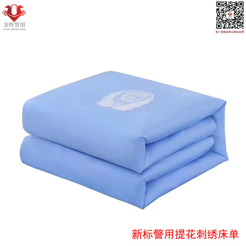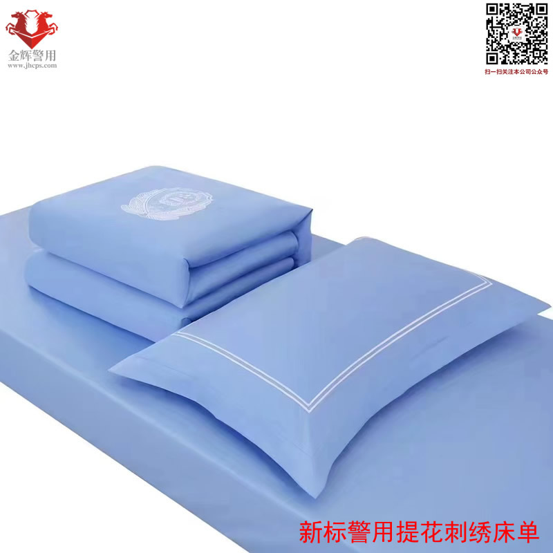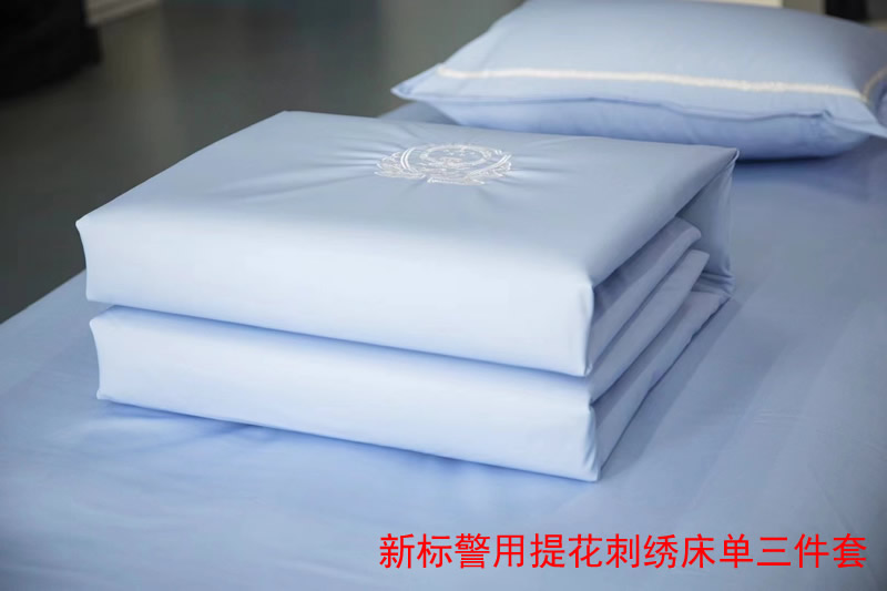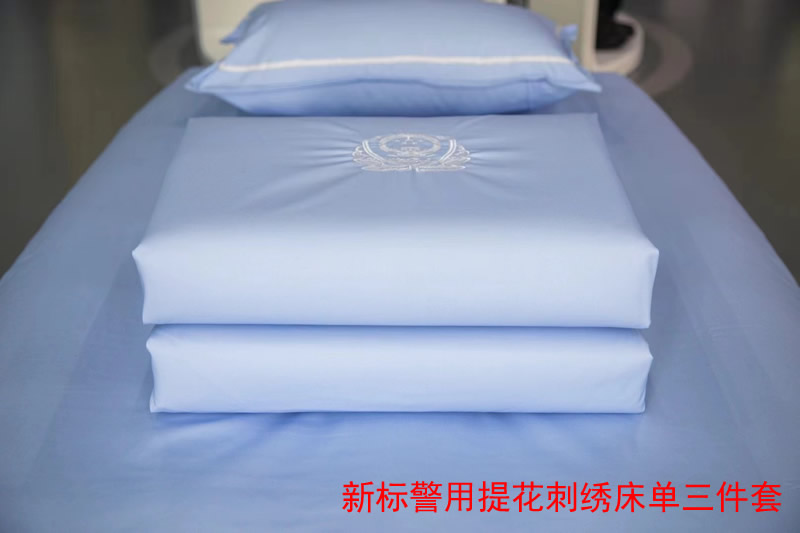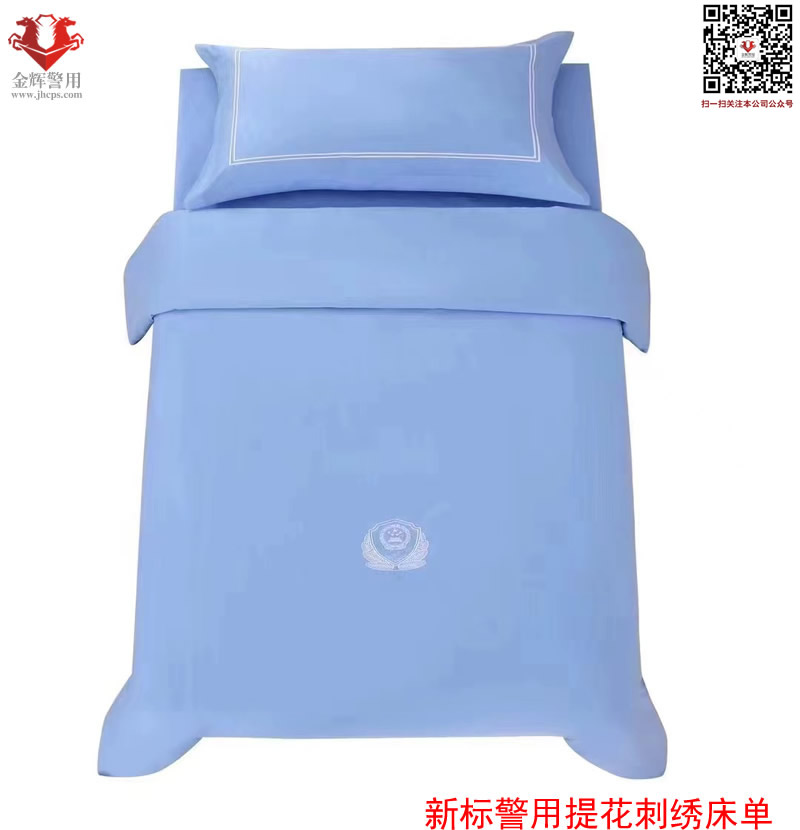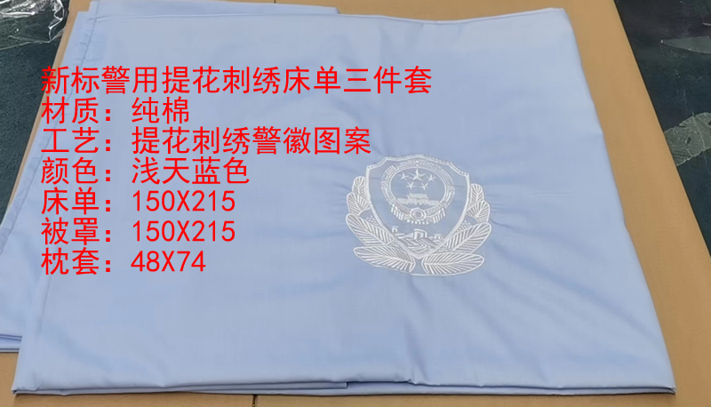 新標警用提花刺繡床單三件套 材質:純棉 工藝:提花刺繡警徽圖案 顏色:淺天藍色(湖藍色) 床單:150X215 被罩:150X215 枕套:48X74