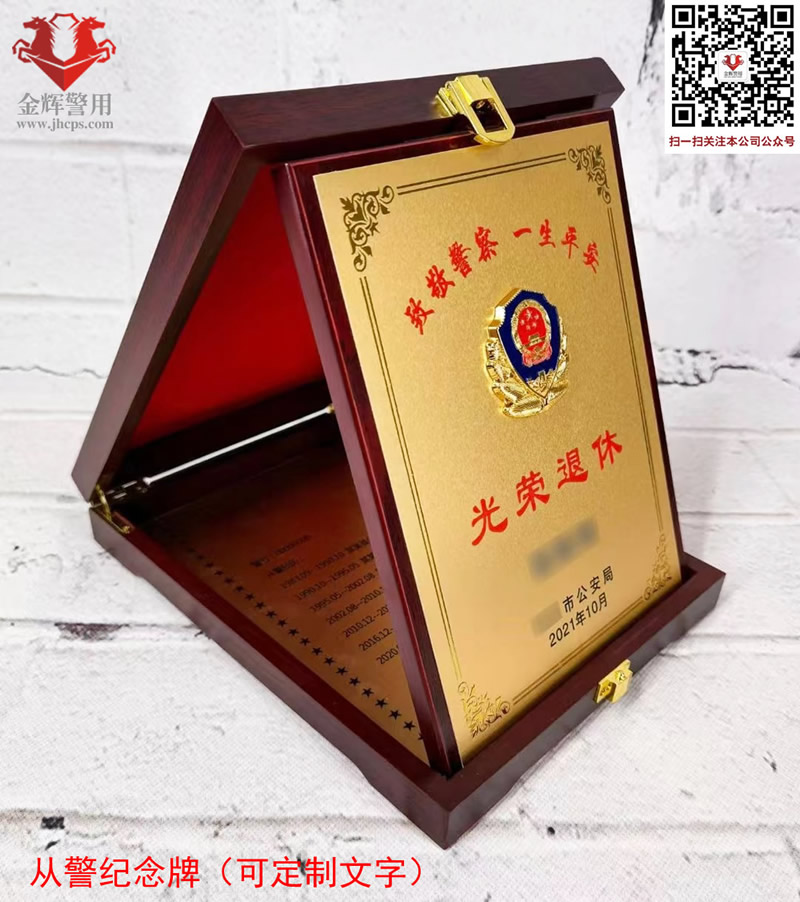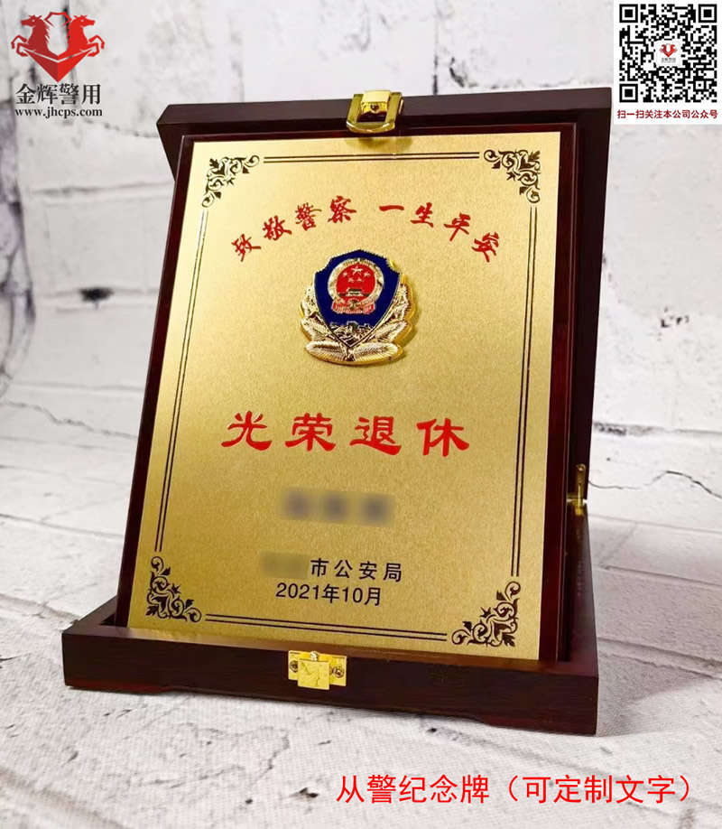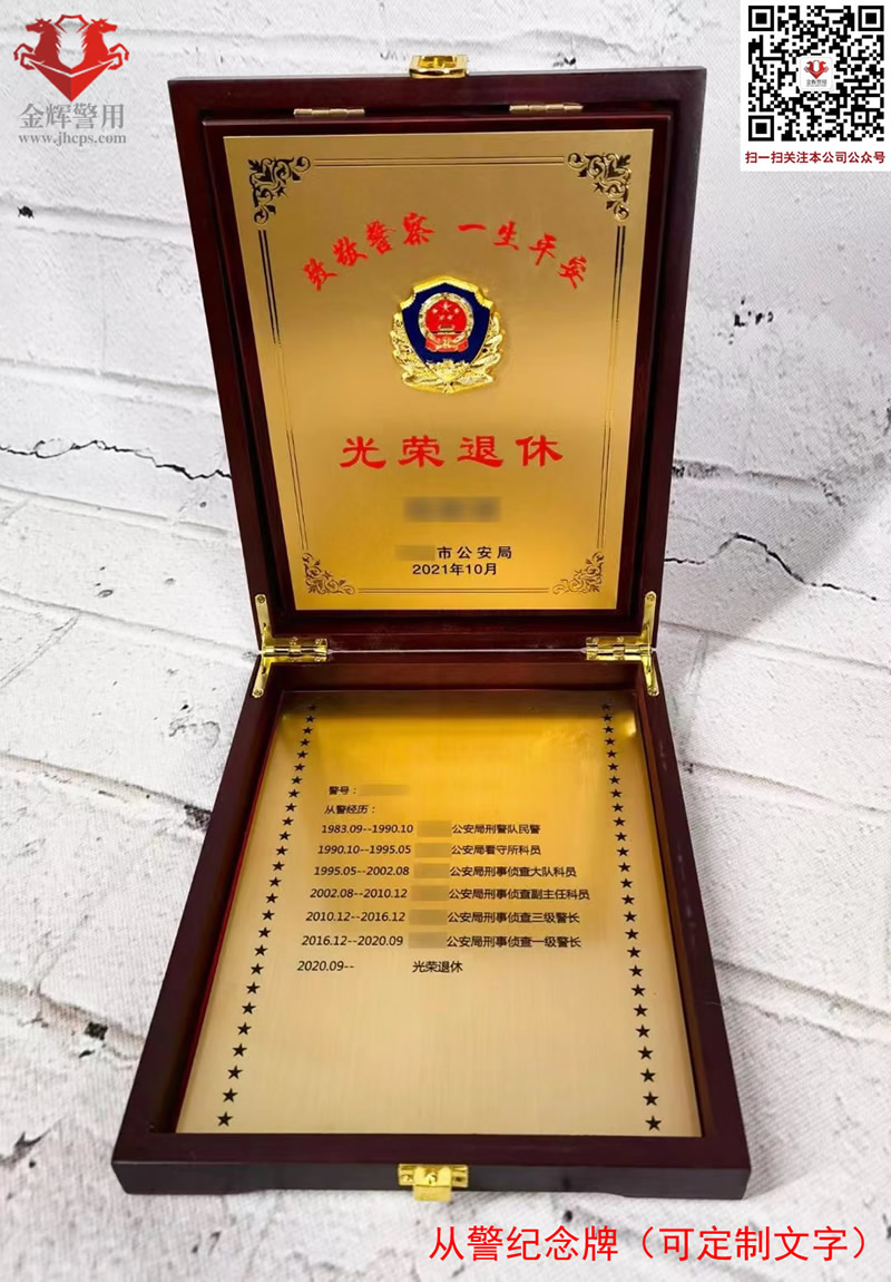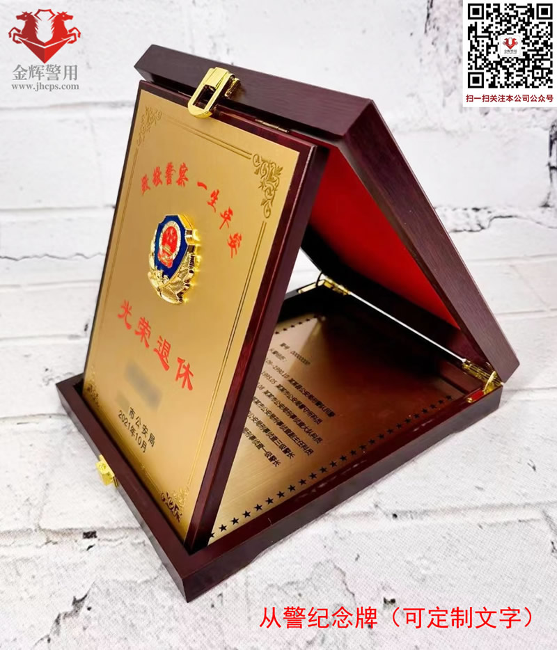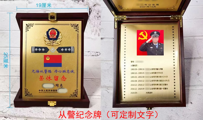從警紀念牌,兩片組成,適合人民警察榮休紀念或者特殊活動獎勵。擺件高端精致,可定制文字。高度25厘米,寬度19厘米。