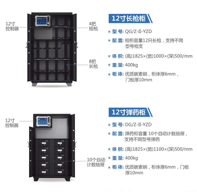 產(chǎn)品規(guī)格:高1800mm,寬1000mm,深500mm,重量約600kg 產(chǎn)品材質(zhì):低合金高強(qiáng)度Q345鋼板 產(chǎn)品說明:智能型II級柜,具備指紋識別與人臉識別,非法操作報(bào)警功能,采用嵌入式主控系統(tǒng),12寸觸摸屏,具備聯(lián)網(wǎng)功能。 標(biāo)配:10個(gè)計(jì)數(shù)子彈抽屜 需要配套使用的其他設(shè)備: 1. 平臺軟件及服務(wù)器2. WEB終端操作機(jī)3. 網(wǎng)絡(luò)交換機(jī)4. UPS電源 備注:具體柜體尺寸及槍支、抽屜數(shù)量可根據(jù)實(shí)際情況定制