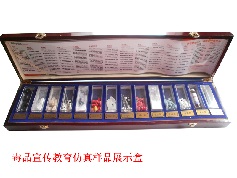 本款產品展示盒是模仿真實毒品物理外觀制作,主要用途為禁毒教育展示,可以用作青少年或者學校禁毒教育工作展示,學習辨別真正毒品外觀原理,本盒子內部共14種常見毒品仿真標本。