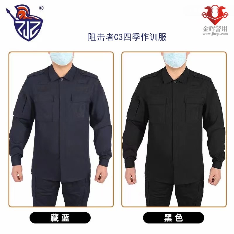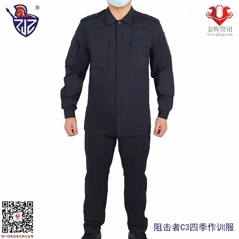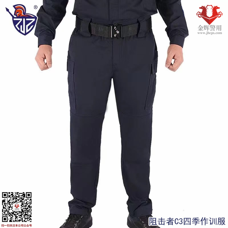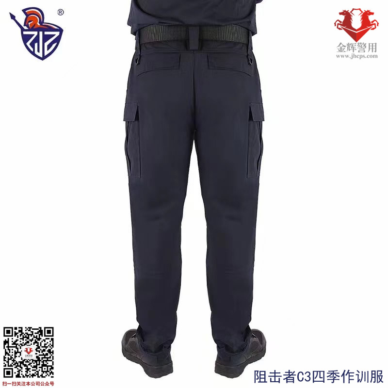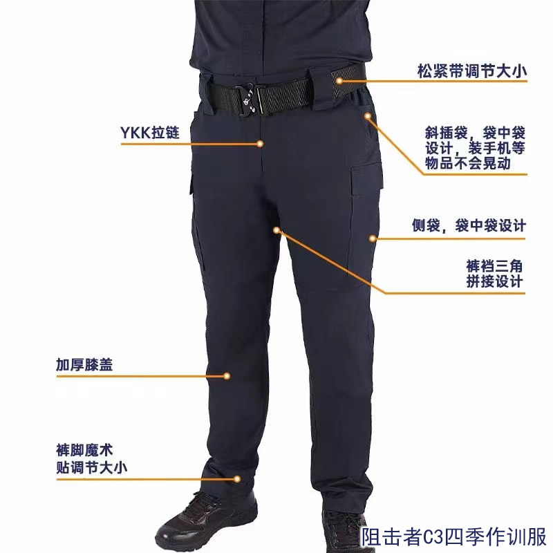 3、整套服裝版型為修身款,立體裁剪,提升精氣神,激光切割工藝提升服裝的整潔度和精準度,褲子拉鏈YKK品牌,左右褲袢各一個D型扣,可以掛載各種小物品。兩個色;黑色,藏藍。