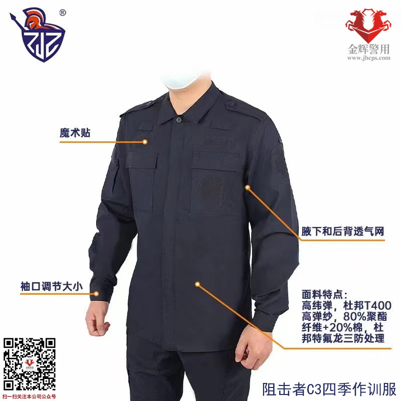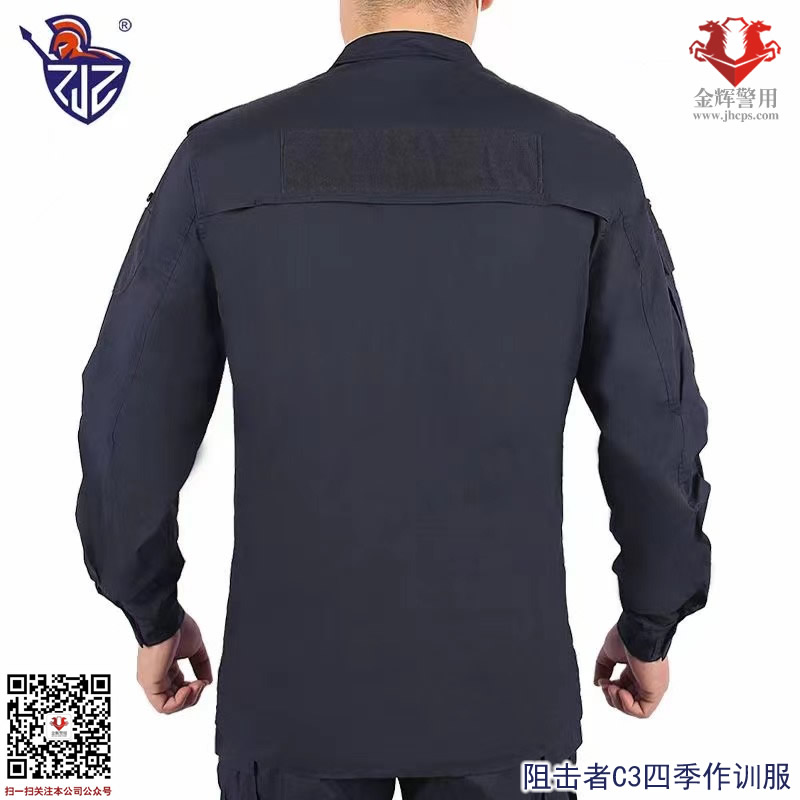 1、上衣右臂一個帶蓋臂袋,臂袋袋蓋有魔術貼,可以粘貼各種標識。左右胸各有一個帶蓋口袋,左胸帶蓋設計有插筆孔,上衣左右腋下和后背透氣網設計,訓練時不悶熱,透氣去濕。