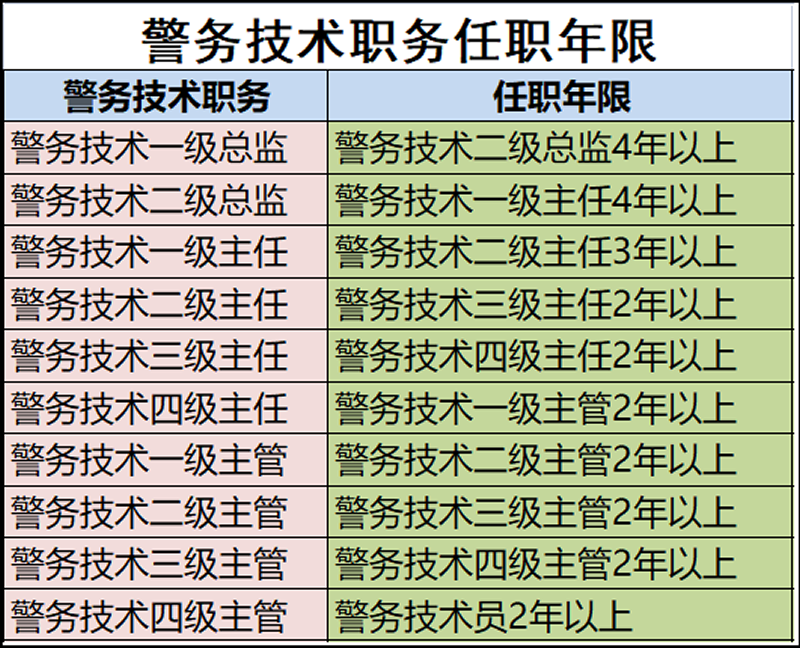 警察執(zhí)法勤務(wù)職級(jí)與公務(wù)員綜合類的情況基本一致,如高級(jí)警長相當(dāng)于調(diào)研員;警長相當(dāng)于主任科員。任職的年限也基本一致,二級(jí)高級(jí)警長提拔以及高級(jí)警長需要3年,一級(jí)高級(jí)警長提拔二級(jí)警務(wù)專員和二級(jí)警務(wù)專員提拔一級(jí)警務(wù)專員需要4年外,其他的提拔均是2年。